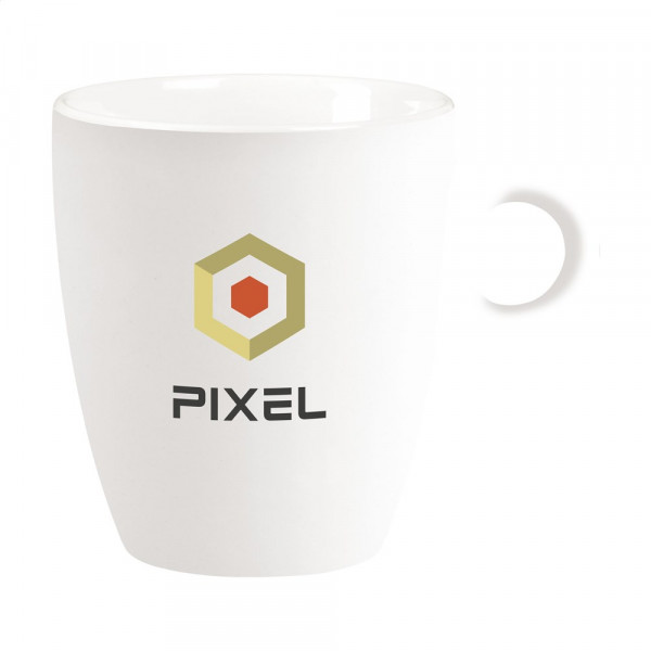 Mok van hoogwaardig keramiek. In geheel wit óf met gekleurde buitenzijde. Geschikt voor alle koffieapparaten. Vaatwasserbestendig. Inhoud 200 ml. De opdruk is vaatwasmachine getest en gecertificeerd: EN 12875-2.