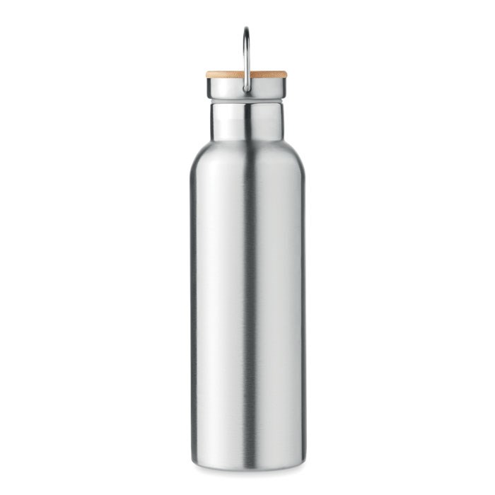 Dubbelwandige vacuüm geïsoleerde RVS drinkfles met bamboe deksel en draagring. Inhoud: 750 ml.Lekvrij. Bamboe is een natuurlijk product, de kleur per artikel kan verschillen.