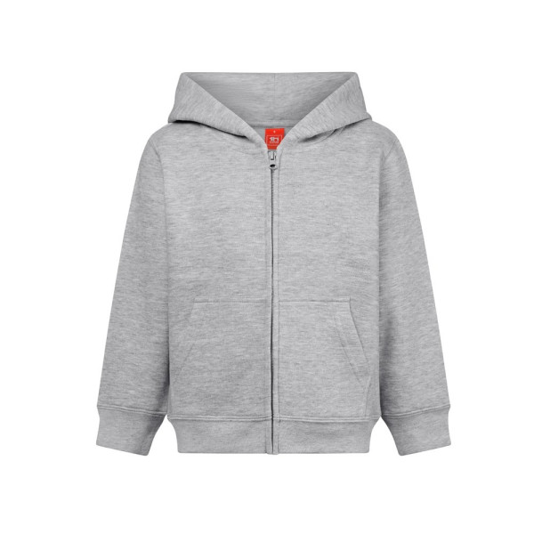 Enzymatisch behandeld kinderjack van Amerikaans badstof (50% katoen met duurzame landbouwpraktijken) en 50% gerecycled polyester (320 g/m²). Capuchon zonder trekkoorden en gevoerd in jersey in dezelfde kleur als het jack, voldoet aan de veiligheidsnormen van de Europese Unie. Bevat 1x1 rib manchetten en onderkant, 2 zijzakken, rits met schuiver, trekker en gekaarde binnenkant. Maten: 4, 6, 8, 10, 12