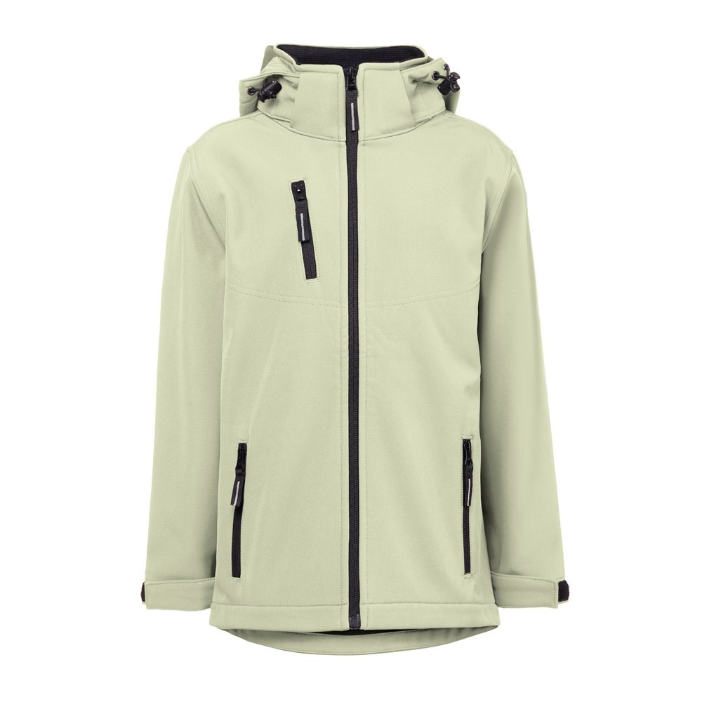 Kinderjas van 96% gerecycled polyester softshell en 4% elastaan (280 g/m²), met twee veters en waterafstotende voering. Met fleece gevoerde jas (100% gerecycled polyester) met 2 voorzakken en een diagonale borstzak, beide met rits. Afneembare en verstelbare capuchon met trekkoord en zelfklevende ritsband om de kraag aan te passen. Opening aan de voorkant met YKK® rits - een merk dat gebruik maakt van moderne apparatuur en hoge kwaliteitscontrole. Verstelbare manchetten met zelfklevende sluitband. Afgeronde onderrug. Maten: 4, 6, 8, 10, 12