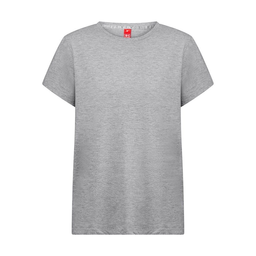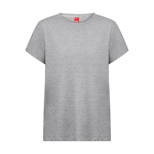 Dames-T-shirt met normale snit (150 g/m²) met enzymatische behandeling in jerseystof (100% katoen van duurzame landbouwpraktijken). Het heeft een dunne dubbele kraag in jersey met een satijnen verstevigingsband. Gesneden en genaaid met dubbele stiksels aan de mouwen en onderkant. Maten: XS, S, M, L, XL, XXL