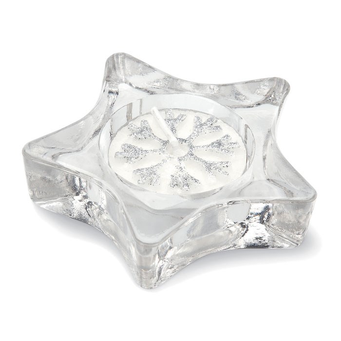 Stervormige glazen theelichthouder in zilveren doosje met transparante deksel en decoratief lint. Inclusief theelichtje.