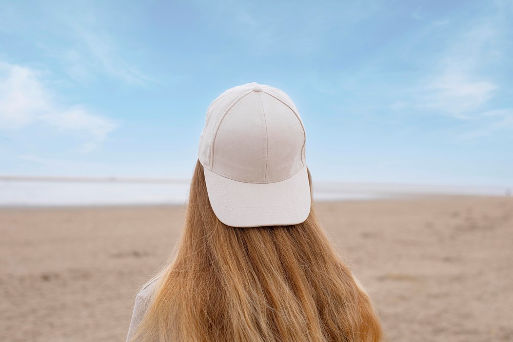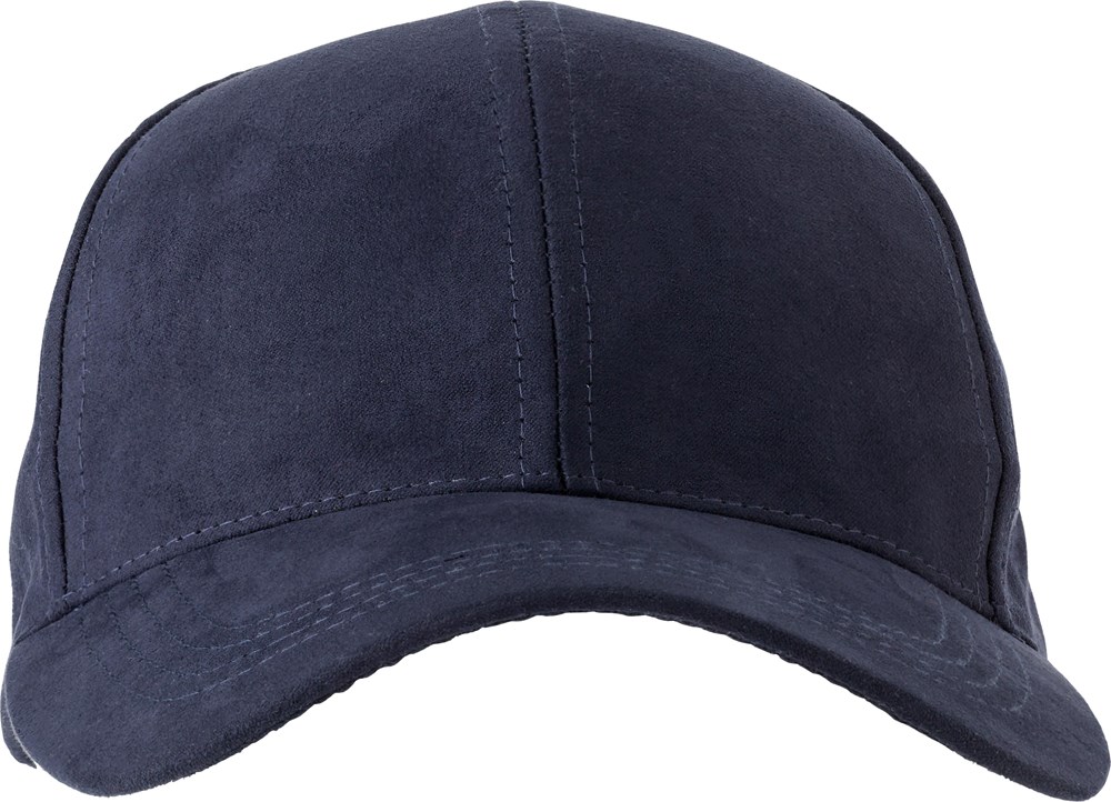 Suède pet met zes panelen en een metalen gespsluiting aan de achterkant. Gaatjes aan de voorkant van het paneel voor.