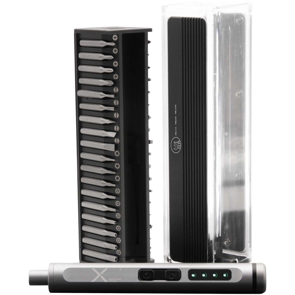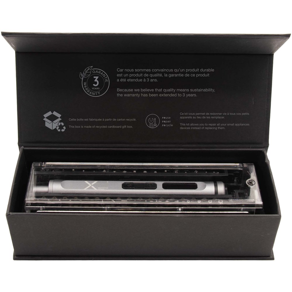 Set met een elektrische schroevendraaier van aluminium en 40 bits voor het repareren van kleine apparaten en andere doe-het-zelf-activiteiten. De bits worden magnetisch door de schroevendraaier aangetrokken. Het logo 'REUSE REPAIR RECYCLE' is gegraveerd op de opbergdoos. Gepresenteerd in een gerecyclede kartonnen geschenkverpakking.