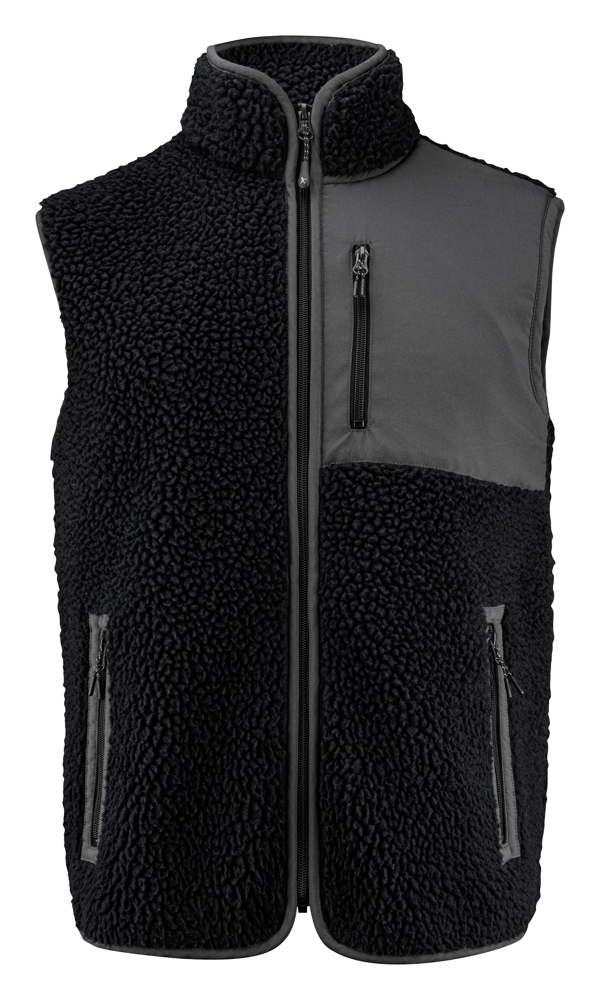 Bicolor teddy fleece bodywarmer. Contrasterende stof op de linkerborst en als afwerking van de naden. Borstzak en zijzakken met ritssluiting.