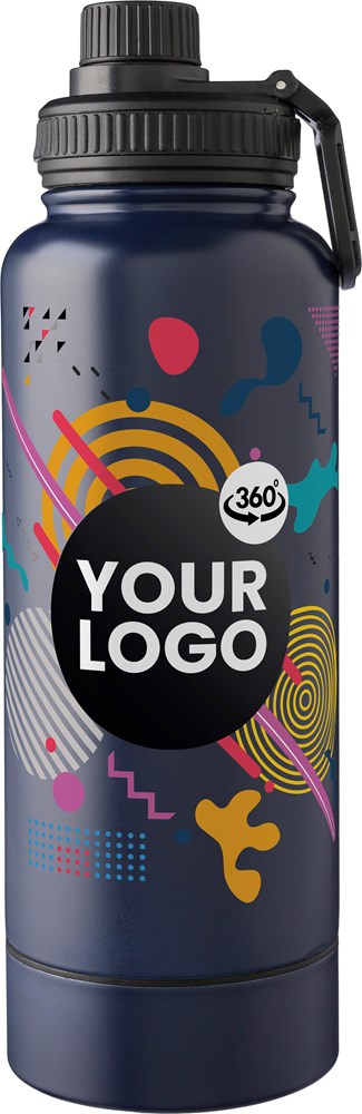 Roestvrijstalen dubbelwandige drinkfles (1000 ml). Voorzien van een schroefdop met drinktuit en draaglus. De bodem heeft een schroefdop met kleine opbergruimte. De binnenkant is van roestvrij staal 304 en de buitenkant van roestvrij staal 201. Per stuk verpakt in een bruin kartonnen doos.