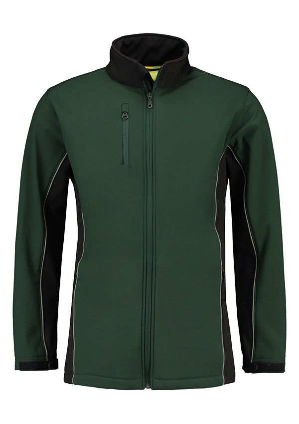Lemon & Soda workwear softshell jacket. Comfortabele jas, gemaakt van een zware kwaliteit softshell. De jas is winddicht, waterafstotend en ademend. Daarnaast heeft het zijzakken met rits, reflecterende piping en een YKK-ritssluiting.