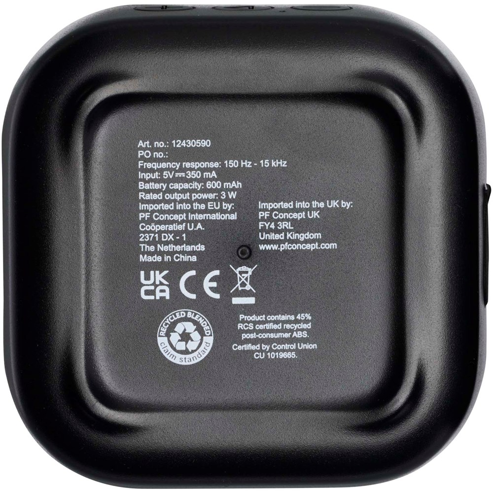 RCS gerecyclede 3 W Bluetooth®-speaker die muziek, podcasts enz. afspeelt vanaf elk Bluetooth®-apparaat, waardoor het een ideale metgezel is voor elke gelegenheid. De speaker heeft ingebouwde muziekbediening en een microfoon voor telefoongesprekken en online vergaderingen. Geniet van maximaal 3-4 uur muziek op maximaal volume. De oplaadtijd is ongeveer 3 uur. Bluetooth® 5.3 met een werkbereik van ongeveer 10 meter. Geleverd met een gebruikershandleiding en een 30 cm USB-A naar Type-C-oplaadkabel en verpakt in een 100% gerecyclede kartonnen doos van duurzame bronnen.
