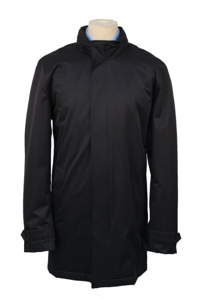100% polyester, waterdicht (2000 mm). 5 knopen met rits, waterdicht, split in het midden, 2 zakken aan de voorkant, gewatteerde voering met 2 binnenzakken, in de kraag opgerolde capuchon. Wasbaar in de machine.