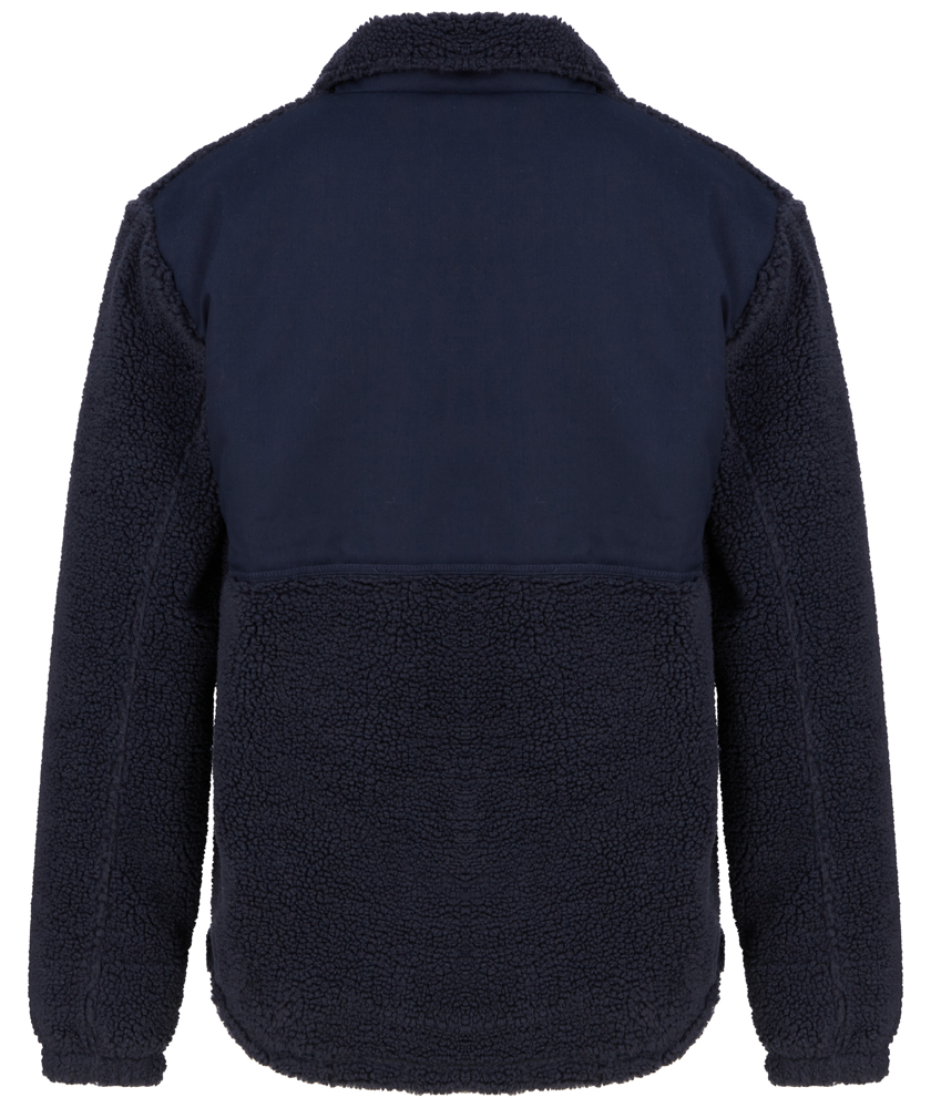 100% gerecycleerd polyester. Contrasterende trechterhals met fleecevoering. Borstzak met ritssluiting. Vilten zijzakken met drukknoopsluiting. Elastische mouwboorden. Regular snit. Elastisch koordje onderaan het jasje.