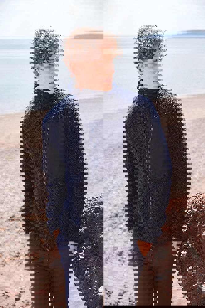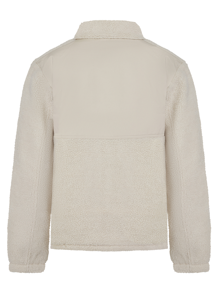 100% gerecycleerd polyester. Contrasterende trechterhals met fleecevoering. Borstzak met ritssluiting. Vilten zijzakken met drukknoopsluiting. Elastische mouwboorden. Regular snit. Elastisch koordje onderaan het jasje.