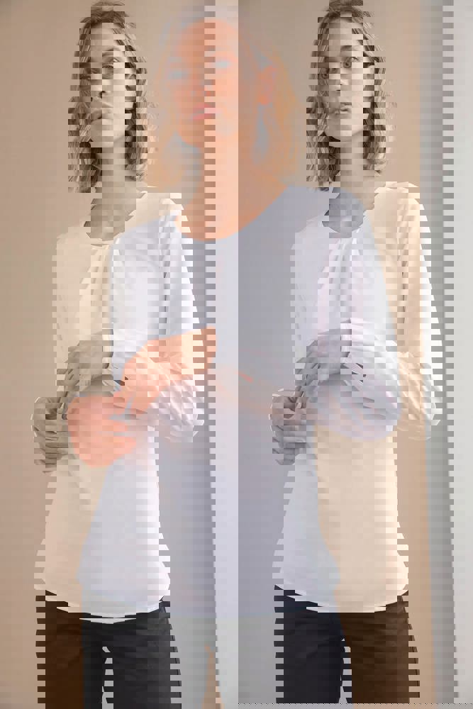 100% Cofrex polyester Pufy®: innovatieve stof die aanvoelt als katoen, anti-UV, ademend en snel drogend, kreukt niet. Halsopening en manchetten met sierplooien. Sluit aan de achterkant en aan de mouwuiteinden met een knoop. Eenvoudig in onderhoud.