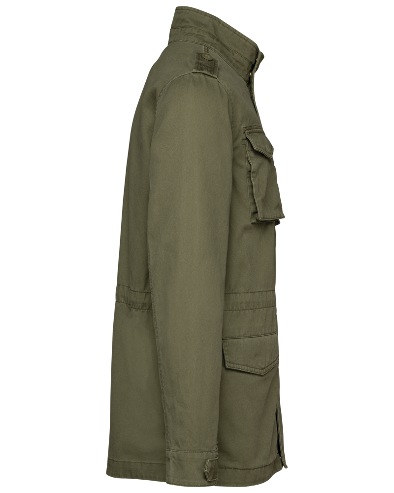 100% katoen. Twillconstructie. Regular fit. Gewassen kledingstuk. Deze techniek maakt dat er kleurverschillen kunnen zijn tussen de producten en elk stuk dus uniek is. Ritssluiting met een metalen schuiver en trekker in de hoofdstof, en een knooplijst met onzichtbare drukknopen in het midden vooraan. Binnenin afgewerkt met een oplegsel. Vier buitenzakken met een drukknoop. Pols met een sierlijst, samengehouden met een drukknoop. Verstelbare aanrijgkoordjes in de tailleband, met stopper met lederlook in het kledingstuk. Schouderlijst met knoop. Binnenzak met klittenband. Halve maan voor eenvoudige personalisatie en ophanglus binnenin.