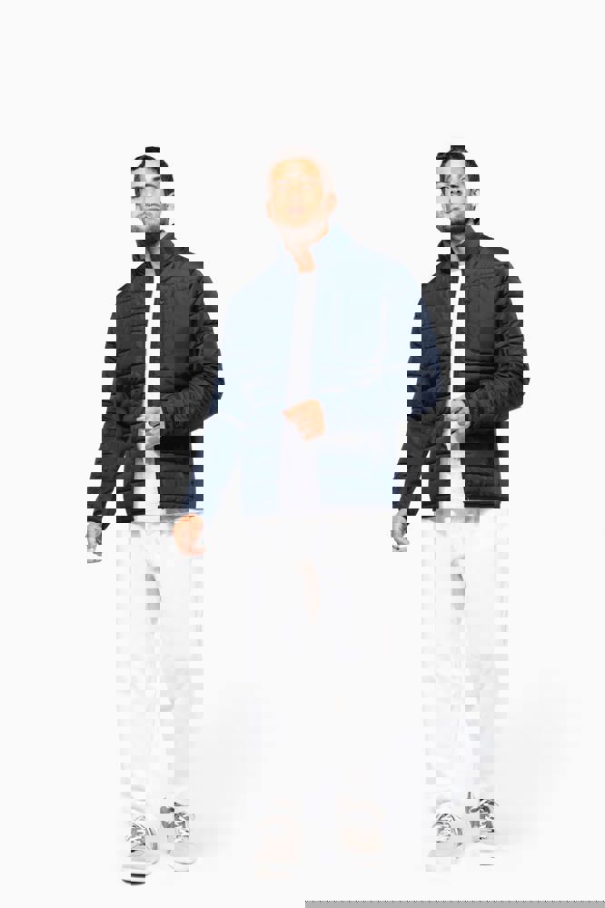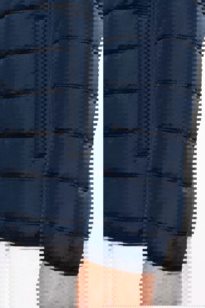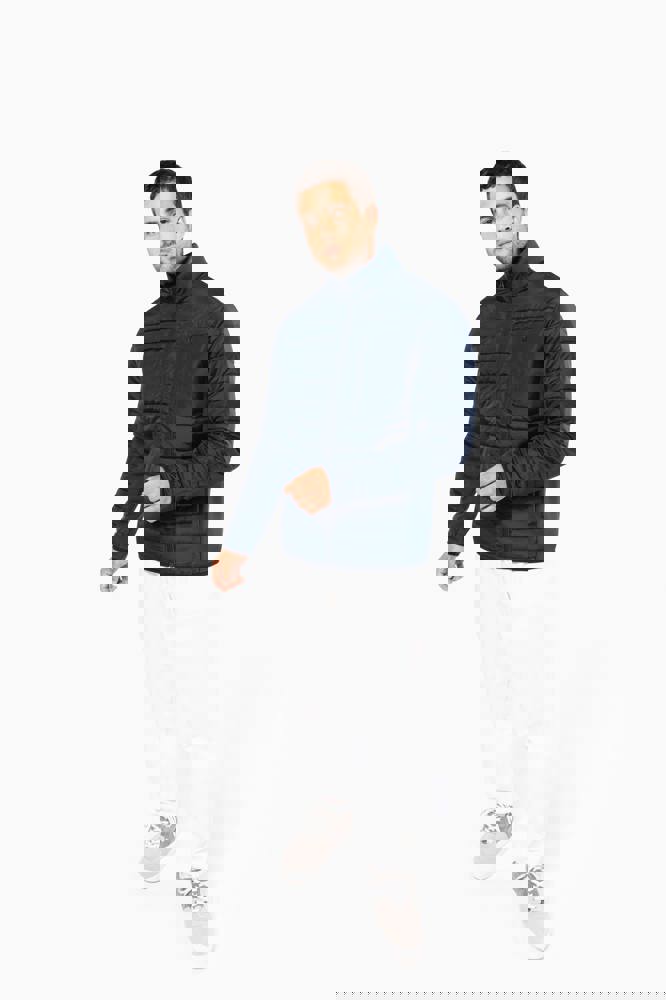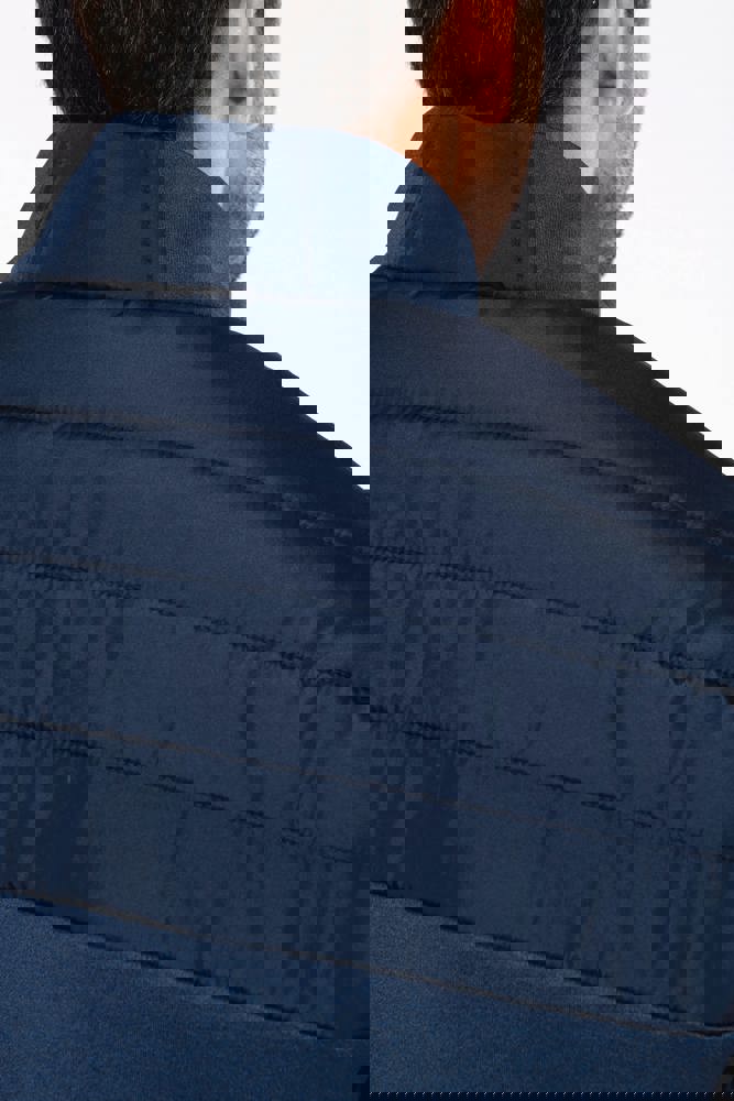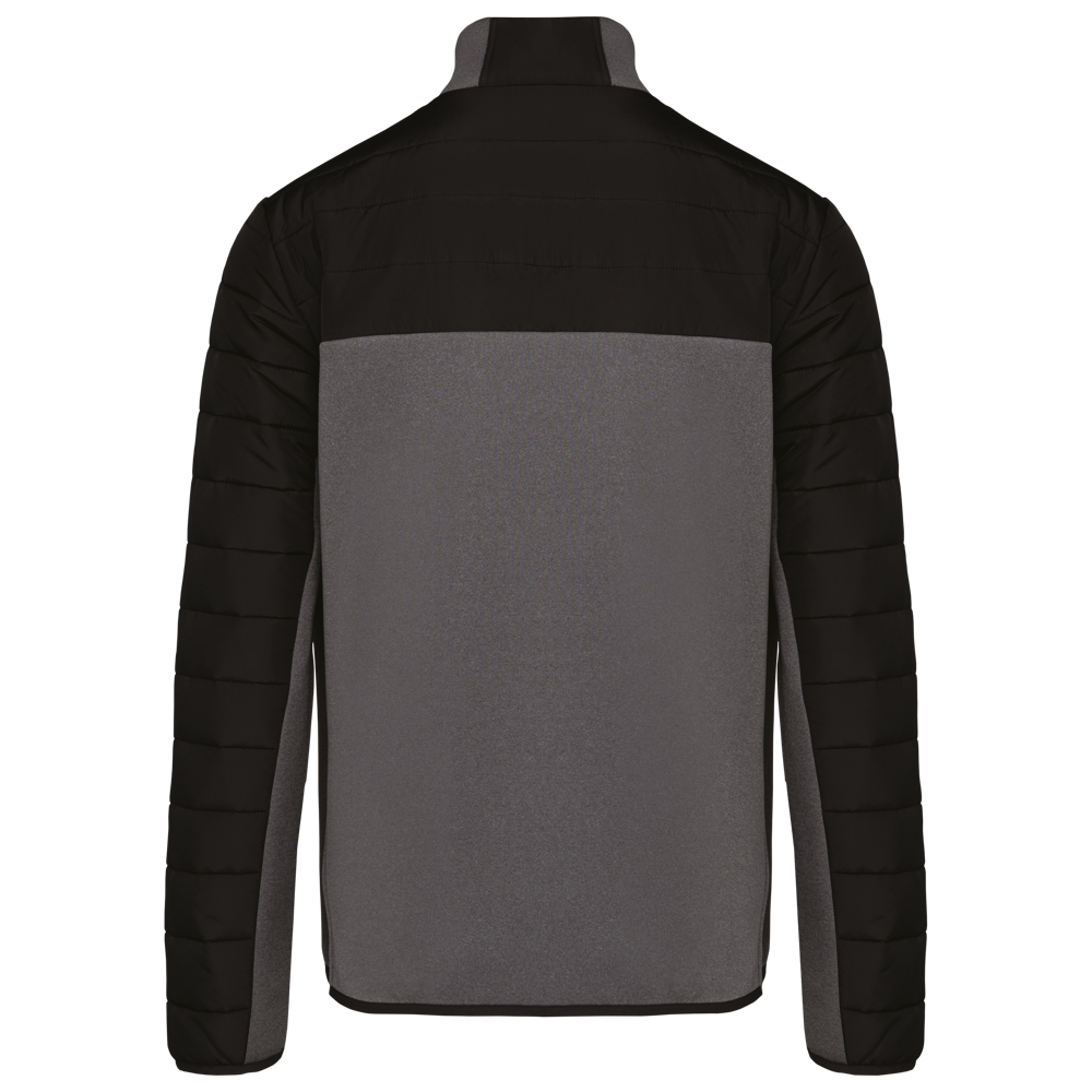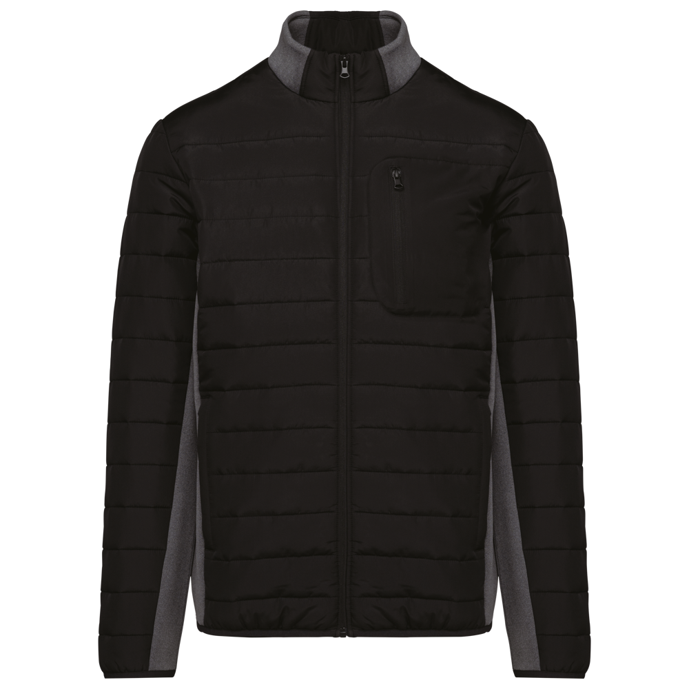 Stof van zijkanten, achterkant, onderkant mouwen en deel van de hals: 94% polyester / 6% elasthan. Stof van bovenkant mouwen, voorzijde en achterkant: 100% pongépolyester 300T met polyurethaancoating. Vulling van 100% polyester 120 g. Voering van 100% gerecycleerd tafpolyester 230T. Body vooraan en een derde van de achterkant gewatteerd. Sluit vooraan met een omgekeerde nylon rits. 2 omzoomde zijzakken aan de voorkant. Opgezette borstzak met omgekeerde rits. Kraag met inzetsels in twee stoffen. Elastische bies aan de mouwuiteinden en onderaan.