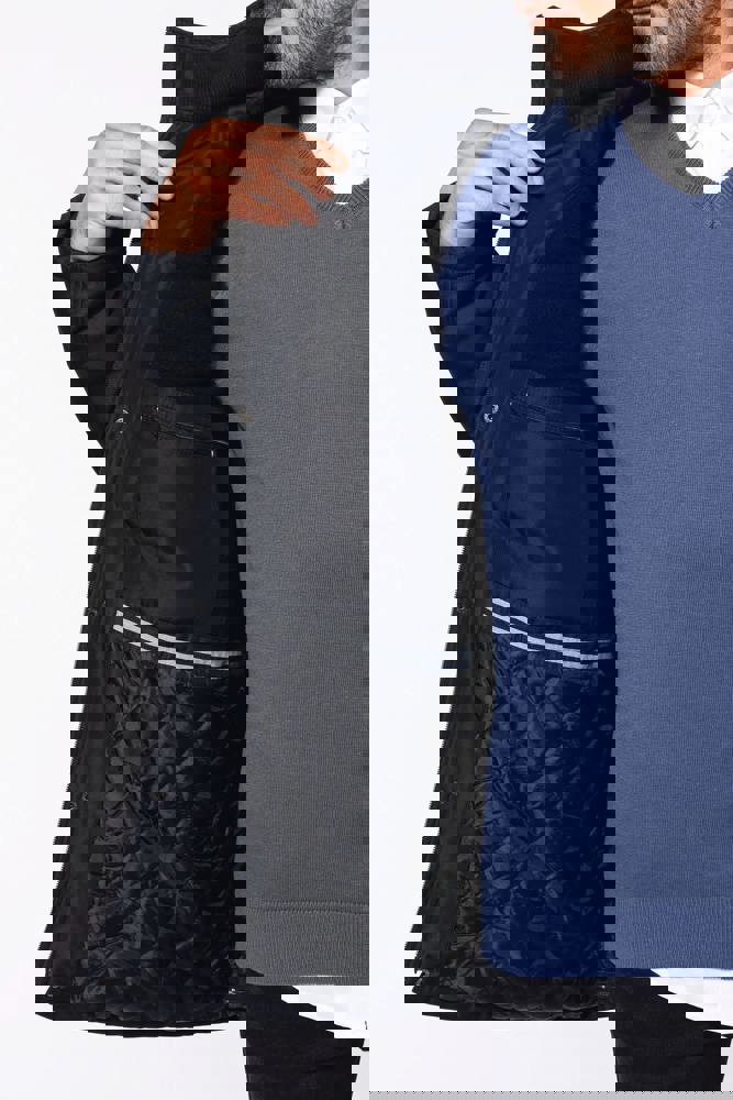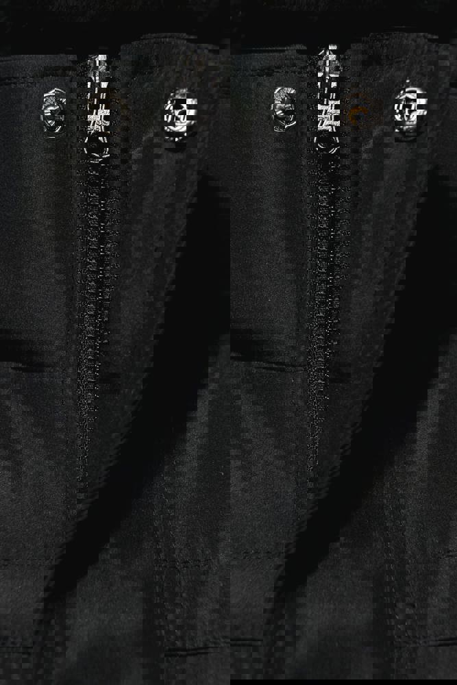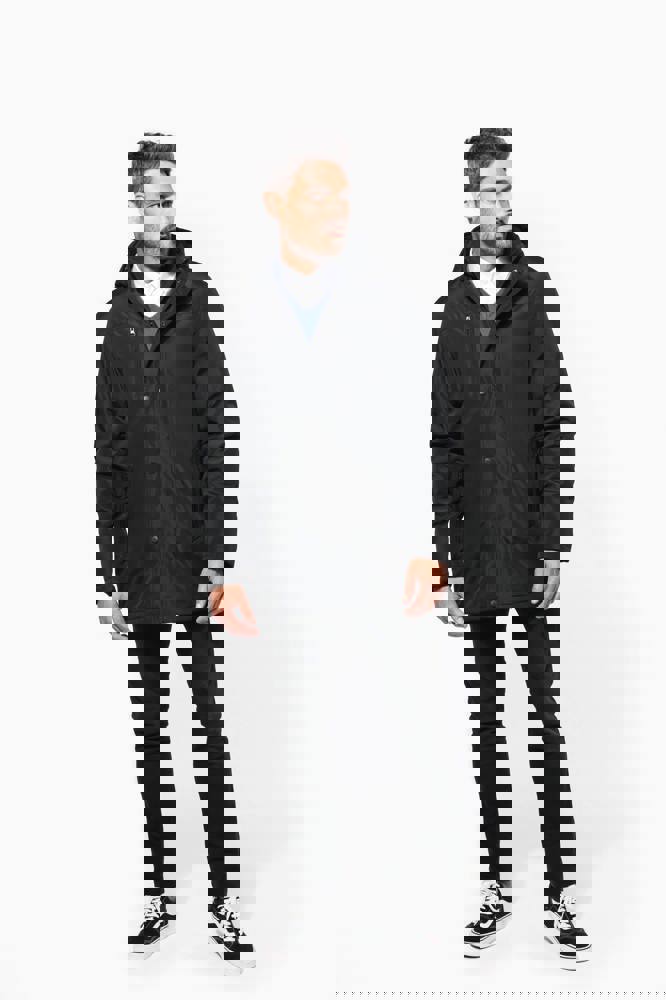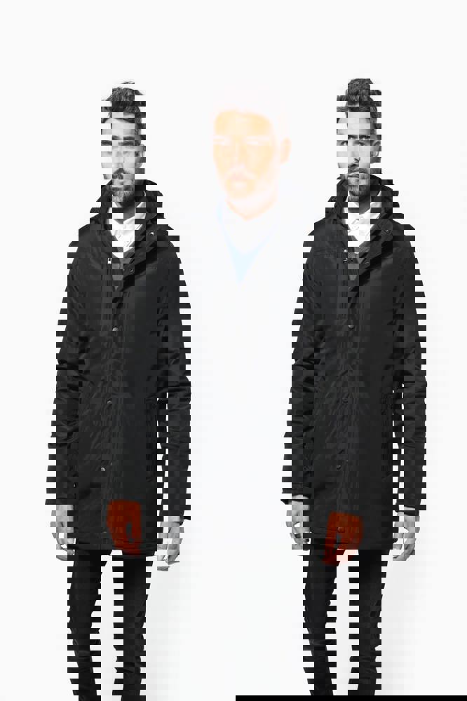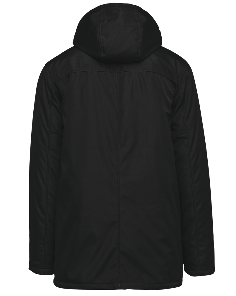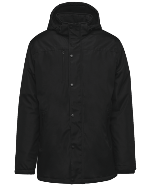 Buitenkant: 100% pongépolyester 230 g/m². Binnenvoering 100% polyester 135 g/m². Binnenkant in twee materialen: microfleece 180 g/m² aan de bovenzijde van de body en gewatteerde voering van polyester 210T 60 g/m² aan de onderzijde. Gesatineerde buitenstof. 2 zakken aan de zijkant en 1 borstzak met rits vooraan. 2 binnenzakken. In ribboord gebreide binnenkraag en afneembare capuchon met fleecevoering. Ritssluiting met dubbele schuiver en stormoverslag. Mouwuiteinden met ribboord aan de binnenkant. Binnenin een tweekleurige fantasiebies. 1 rits aan de linkerkant en 1 drukkersrits.