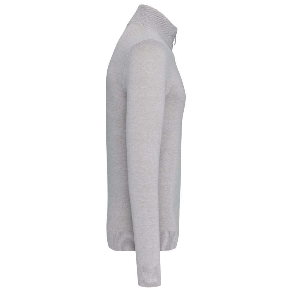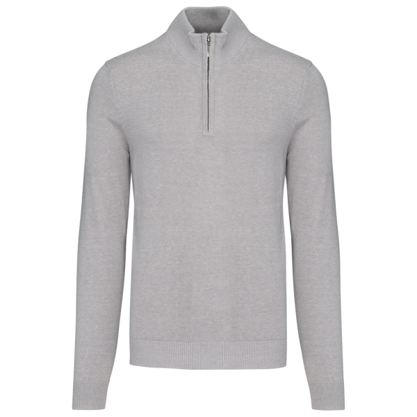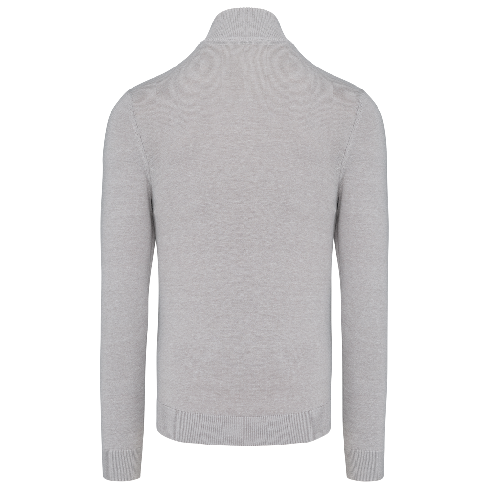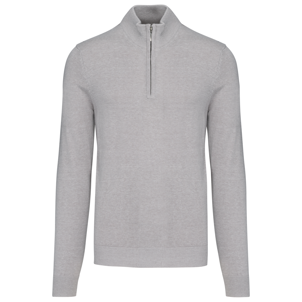 50% katoen / 50% acryl. Rechte snit. 2-laagse kraag in rib. Ritskraag in metaalkleur. Nektape.