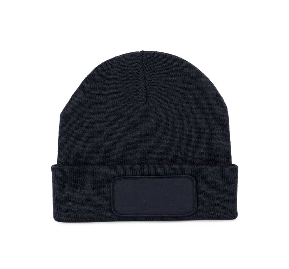 50% gerecycled polyester, 50% acryl. Muts met gebreide omslag in acryl en polyester. Katoenen patch aan de voorkant, voor eenvoudige personalisatie. Tear-away merklabel.