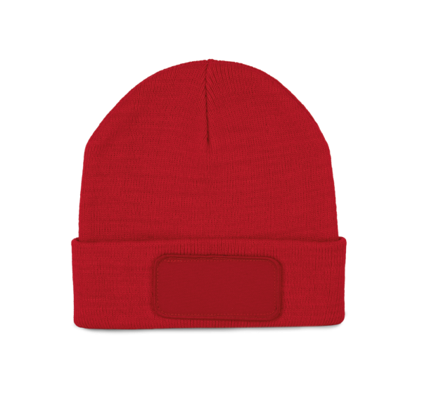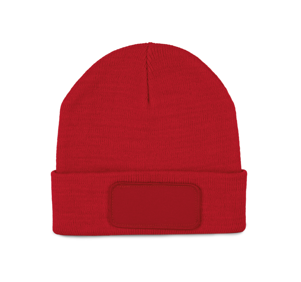 100% acryl. Gebreide muts met omslag in zacht acryl. Katoenen patch aan de voorkant, voor eenvoudige personalisatie. Tear-away merklabel.