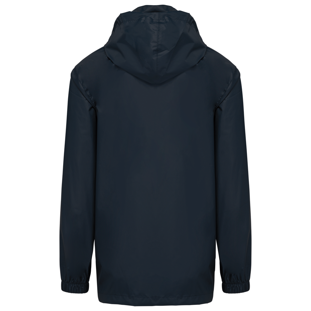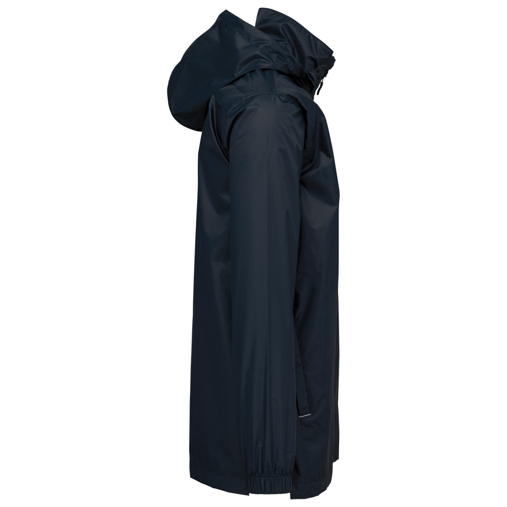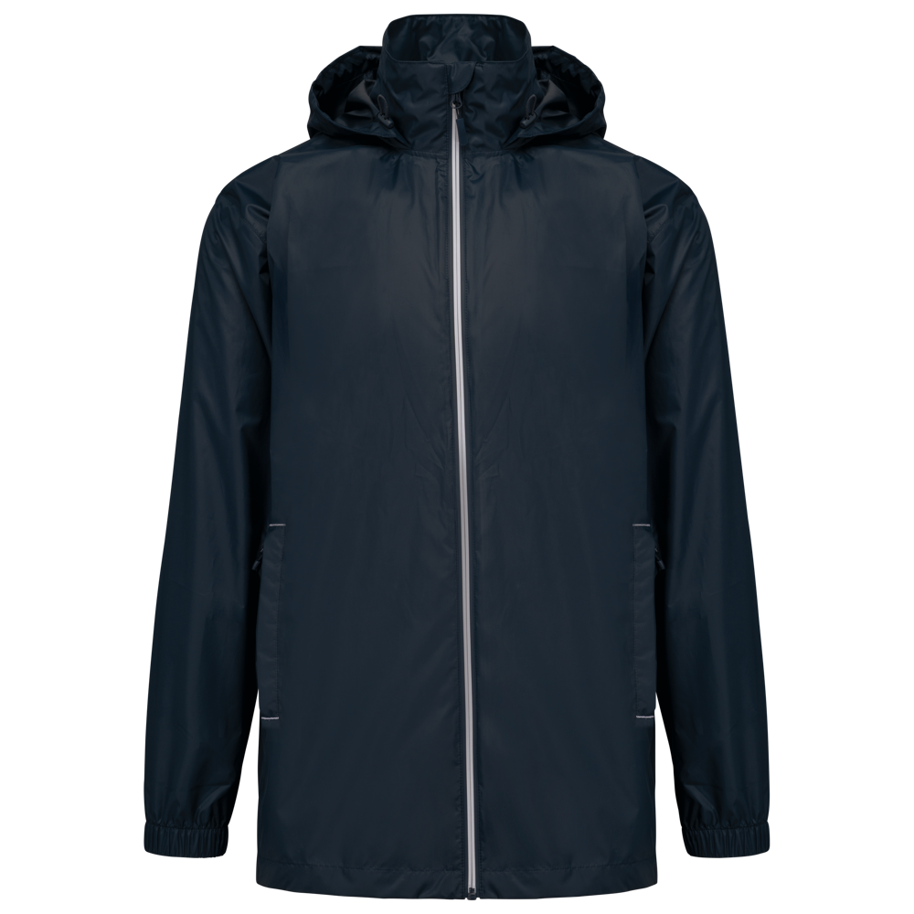 100% mat 210T polyester met PU-coating. Waterdichte stof 1500 mm. Waterdichte, thermisch verzegelde schoudernaden en capuchon. 2 zijzakken met rits en ritstrekker. 2 binnenzakken. Contrasterende ritssluiting vooraan. Aanpasbare capuchon met stoppers in de kraag en klittenband-knooplijst. Elastische mouwuiteinden. Afneembaar merklabel.