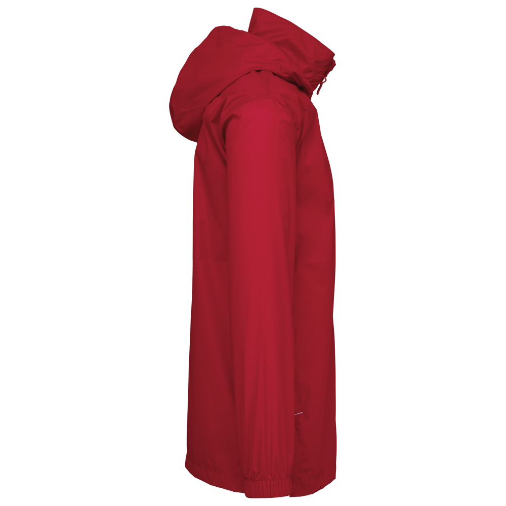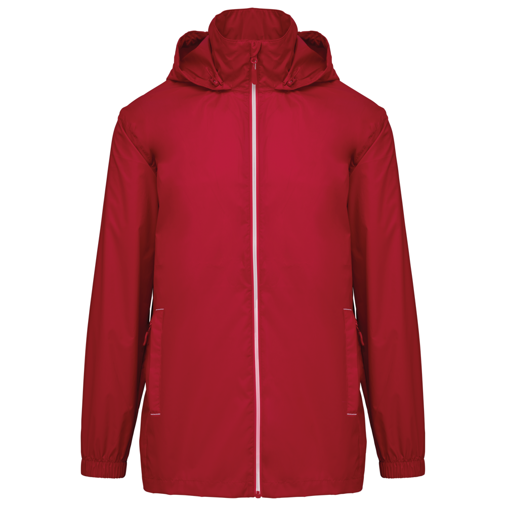100% mat 210T polyester met PU-coating. Waterdichte stof 1500 mm. Waterdichte, thermisch verzegelde schoudernaden en capuchon. 2 zijzakken met rits en ritstrekker. 2 binnenzakken. Contrasterende ritssluiting vooraan. Aanpasbare capuchon met stoppers in de kraag en klittenband-knooplijst. Elastische mouwuiteinden. Afneembaar merklabel.