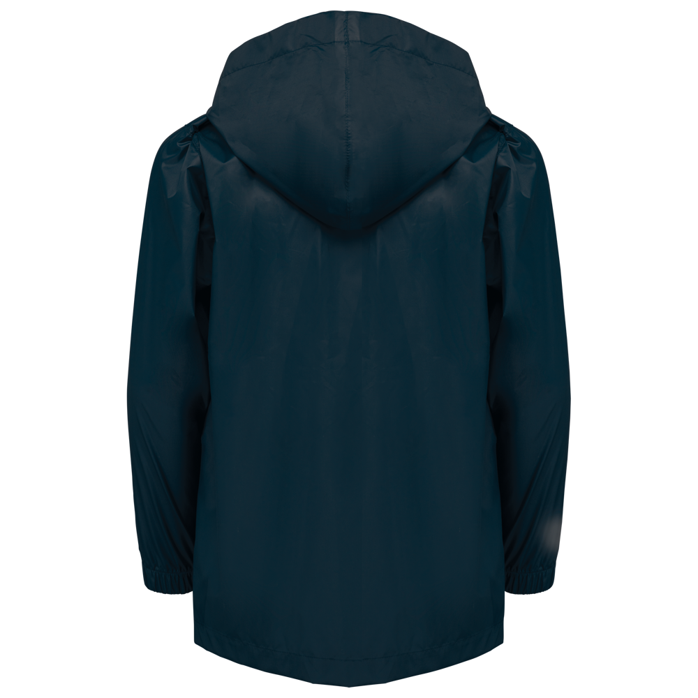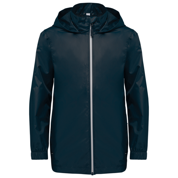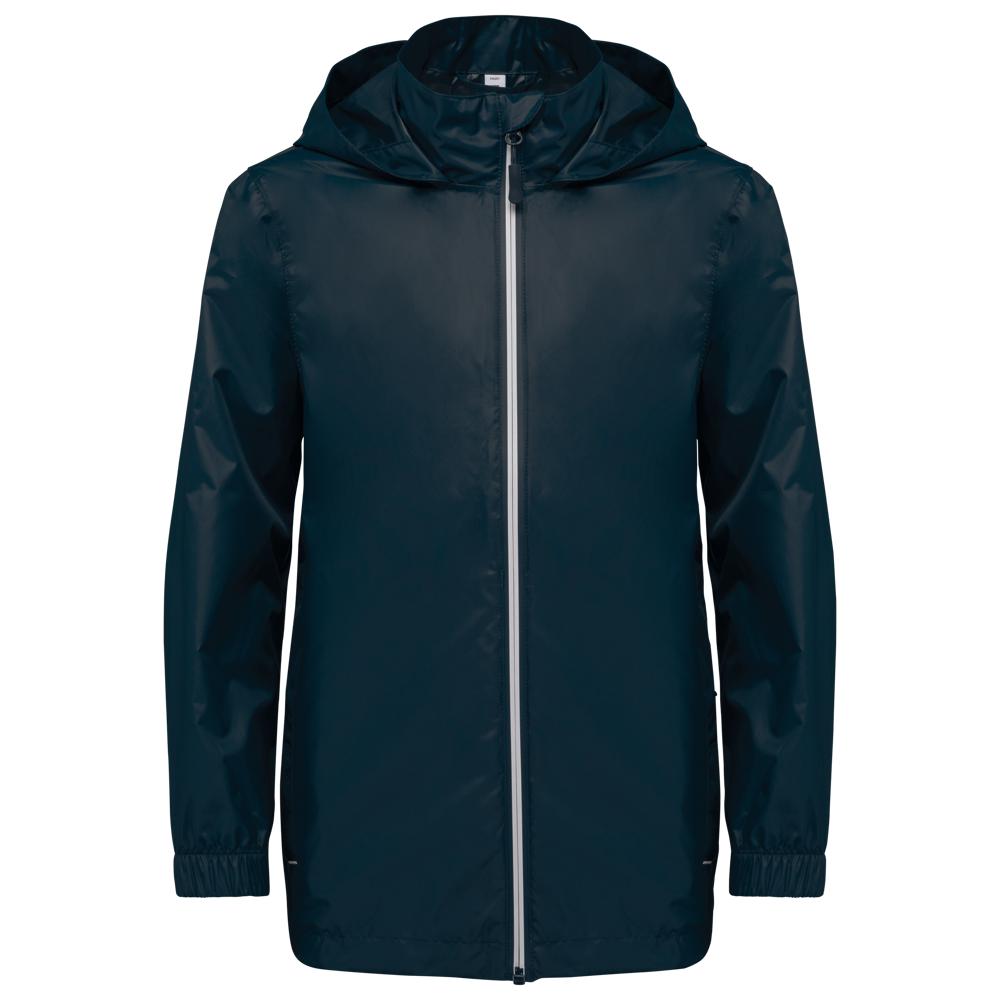 100% mat 210T polyester met PU-coating. Waterdichte stof 1500 mm. Waterdichte, thermisch verzegelde schoudernaden en capuchon. 2 zijzakken met rits en ritstrekker. 2 binnenzakken. Contrasterende ritssluiting vooraan. Capuchon in de kraag met klittenbandbevestiging. Elastische mouwuiteinden. Afneembaar merklabel.