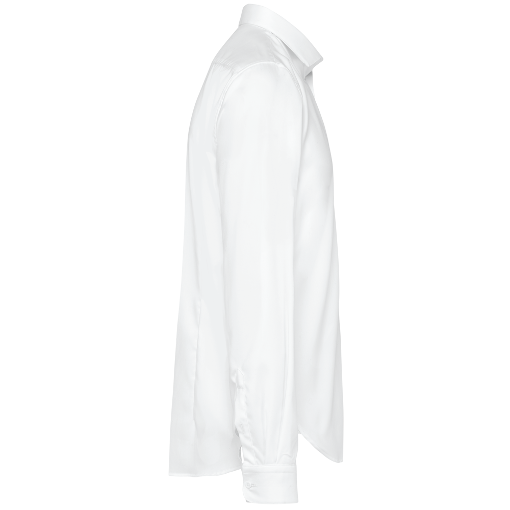 100% katoen. Gekamd katoen. Pinpoint Oxford-stof. Gemakkelijk in onderhoud (EasyCare-behandeling). Dubbel getwijnd garen 80x2 van topkwaliteit. Italiaanse kraag met uitneembare baleinen. Paarlemoeren knoopjes. Inzetsel aan de bovenkant van de rug. 2 plooien op de achterkant. Fitted pasvorm. Manchetten met 2 knopen en afgeronde hoeken. Verstevigende driehoekjes op de zijkanten. Geen merklabel, maar enkel een maatlabel voor eenvoudige personalisatie.