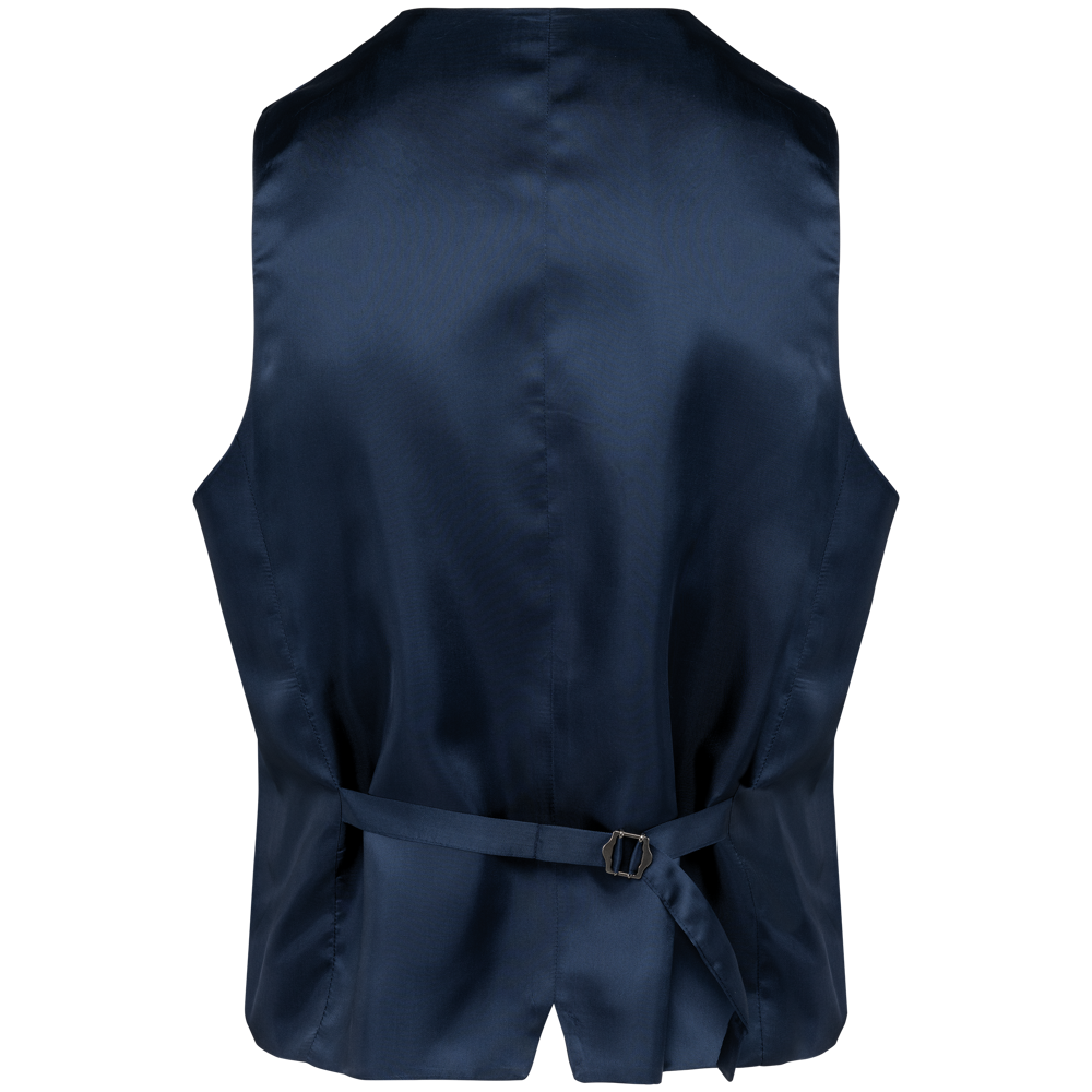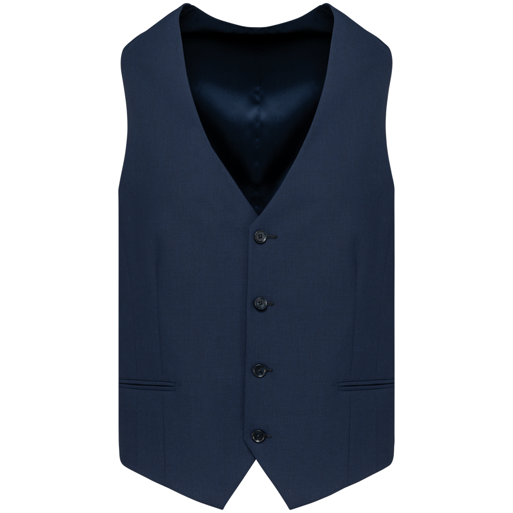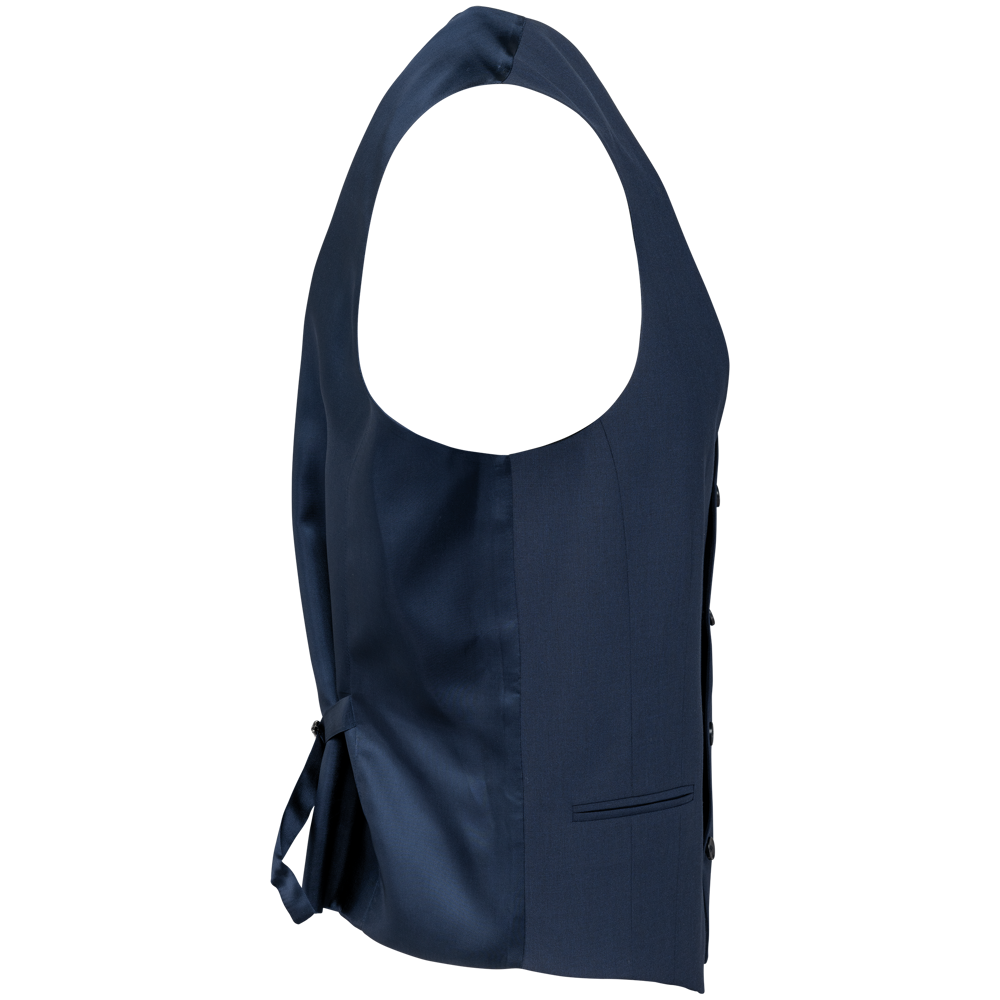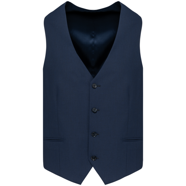50% polyester / 23% viscose / 22% wol / 5% elasthan. Ander toon-op-toon materiaal in twill (100% polyester) op de buitenkant van de rug en binnenin. Rechte snit. Het gilet sluit met vier toon-op-toon knopen (met een reserveknoop) vanaf maat 58. Twee zakken met bies aan de voorkant. Verstelbare lijst met metalen gesp op de achterkant. Naad midden op de rug, afgewerkt met een V-vormige split onderaan. Geen merklabel, maar enkel een maatlabel voor eenvoudige personalisatie.