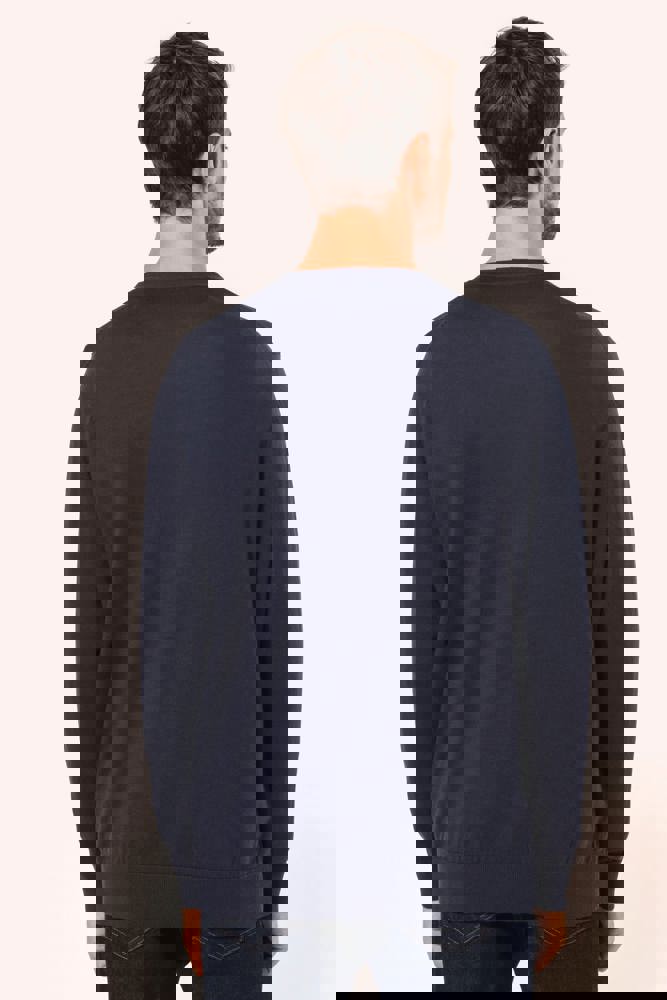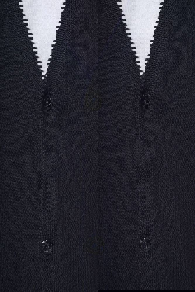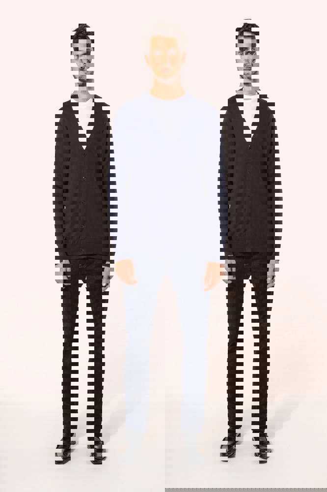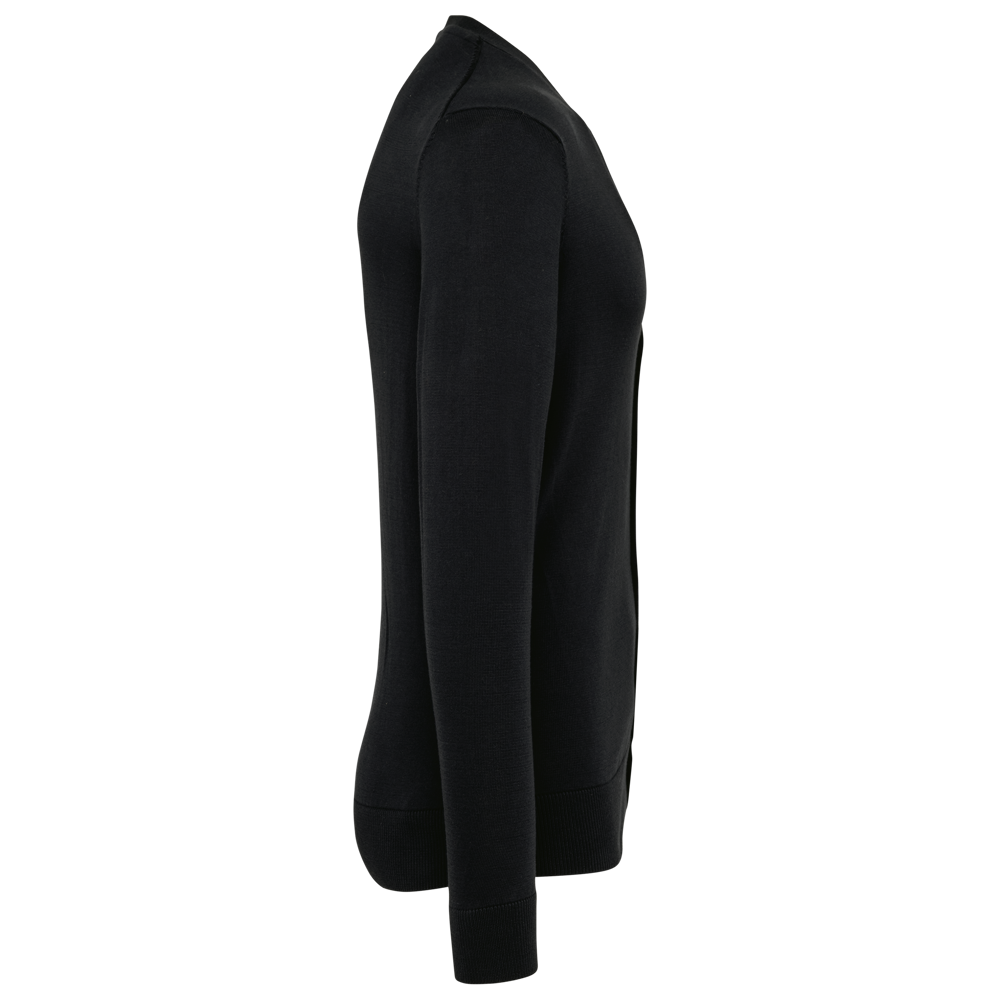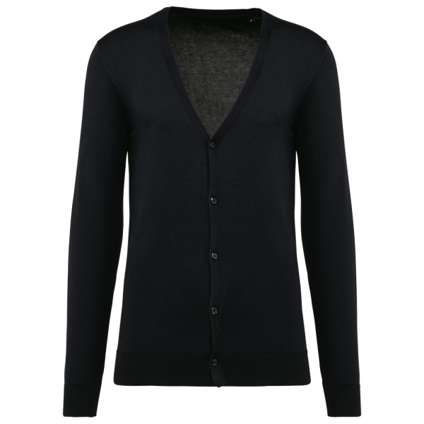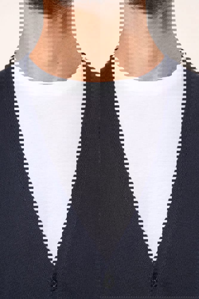 100% Supima® katoen. Gekamd katoen. Gauge 12. Stof van topkwaliteit. Fully-fashioned: gebreid in de vorm en geassembleerd op de machine. Halsopening, mouwuiteinden en onderkant in 1x1 ribboord. Knoopsgat met plastic knopen. Ton-sur-ton.