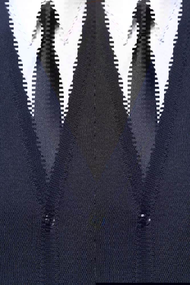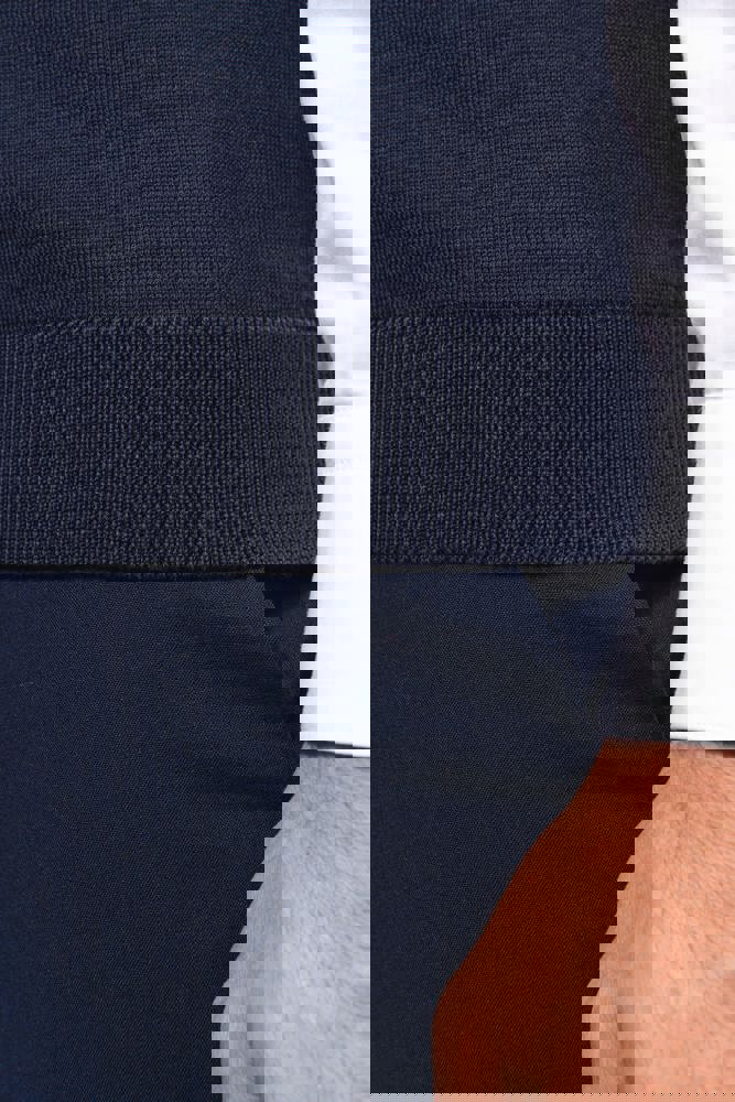 100% Supima® katoen. Gekamd katoen. Gauge 12. Rechte snit. Fully-fashioned afgewerkte mouwopening: gebreid in de vorm en geassembleerd op de machine. Halsopening, knoopsgat en onderzijde in 1x1 ribboord. Mouwopening in gevoerde 1x1 ribboord. Knooplijst met toon-op-toon knopen. Geen merklabel, maar enkel een maatlabel voor eenvoudige personalisatie.