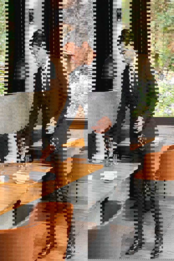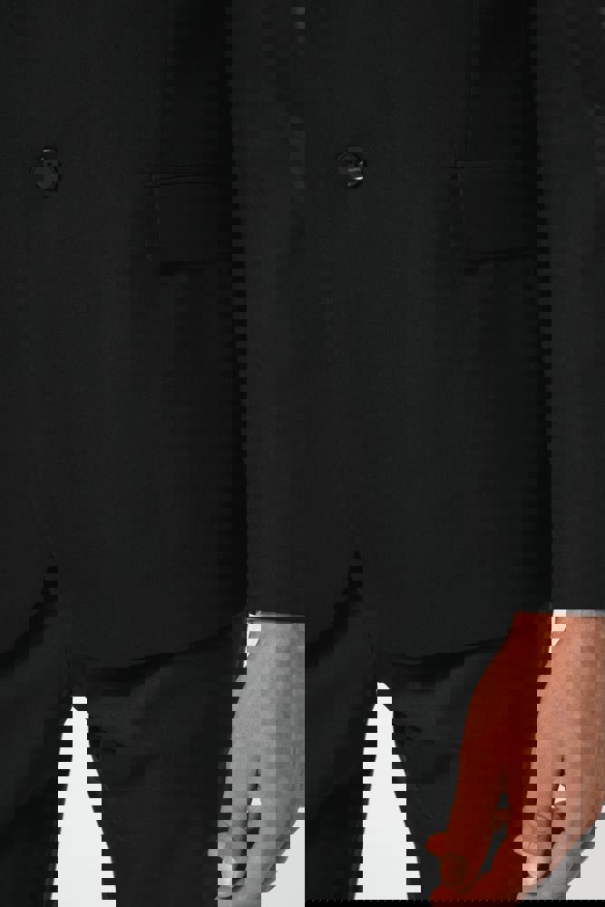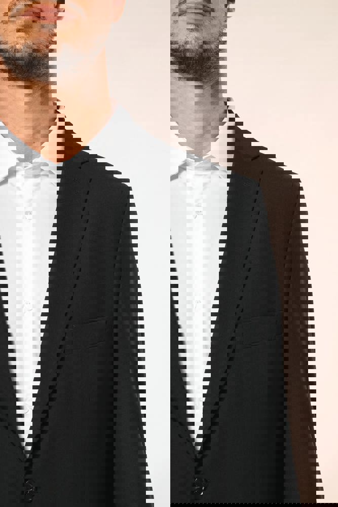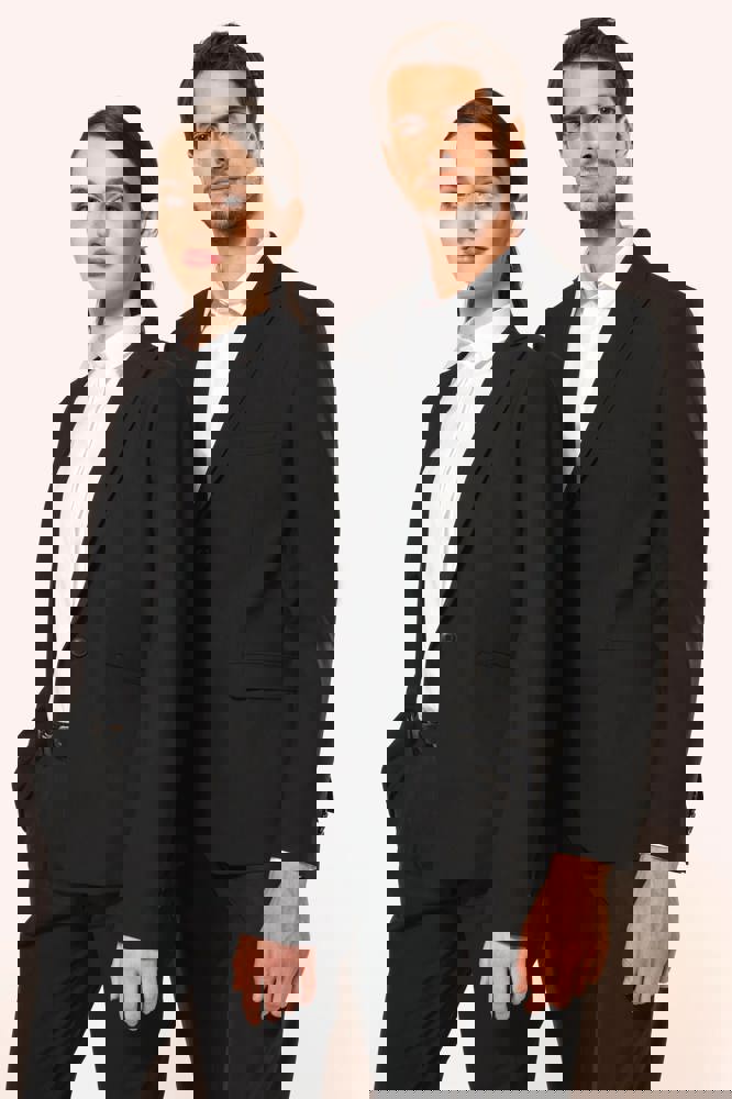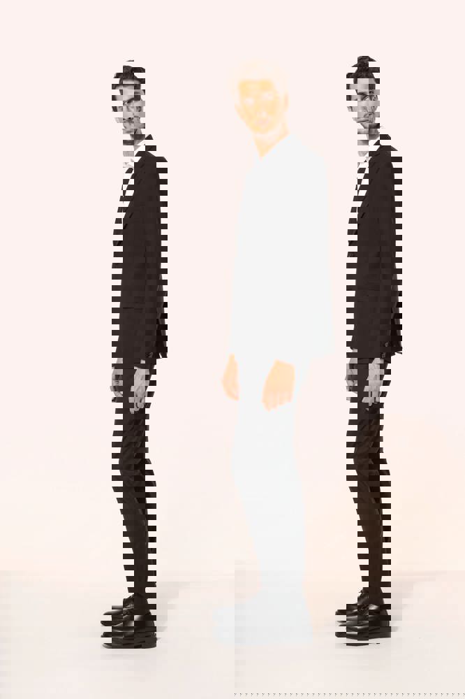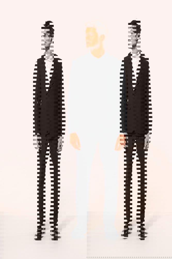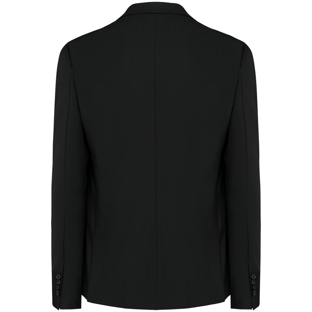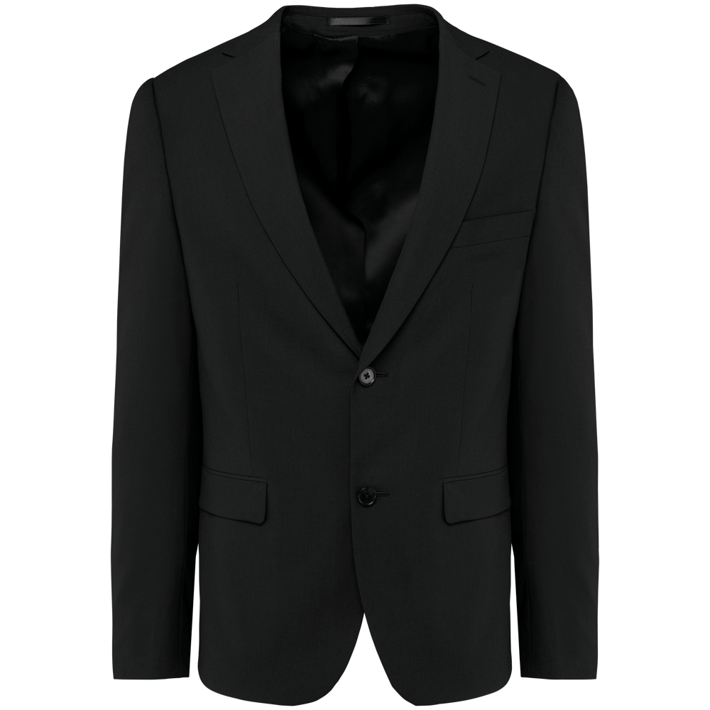 50% polyester / 23% viscose / 22% wol / 5% elasthan. Toon-op-toon voering in twill (100% polyester). Rechte snit. Jasje met twee ton-sur-ton knopen. Twee zakken met biesjes en kleppen, en een borstzakje met bies op de hartzijde. Vals toon-op-toon knoopsgat op de revers. Inzetsel opzij om het product vorm te geven. Satijnen ophanglus in de halsopening. Naad midden op de rug, Twee splitten onderaan. Mouwuiteinden met valse split en 4 toon-op-toon knopen. De twee borstzakjes binnenin zijn afgewerkt met een contrasterende bies. Links aan de binnenkant (bij het dragen) zitten een telefoonzakje en een ticketzakje met toon-op-toon bies. Drukkersrits aan de linkerkant (bij het dragen). Geen merklabel, maar enkel een maatlabel voor eenvoudige personalisatie.