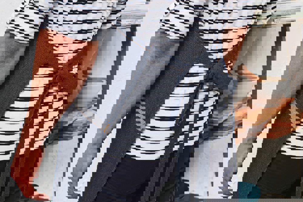 Natural Denim: 44% gerecycleerd katoen, 37%gerecycleerd polyester, 19% gerecycleerd viscose.Grey Denim: 55% gerecycleerd katoen, 36% gerecycleerd polyester, 9% gerecycleerd viscose.Black Denim: 53% gerecycleerd katoen, 41% gerecycleerd polyester, 6% gerecycleerd viscose.Indigo Denim: 58% gerecycleerd katoen, 36% gerecycleerd polyester, 6% gerecycleerd viscose. Gerecycleerd katoen, gerecycleerd polyester, vezelmix gemaakt van gerecycleerd denim. Schuine zijzakken met contrasterende boord. Geknoopte en verstelbare halsriem. Contrasterende stiksels. Verstelbare gesp in antiek messing op de halsriem.