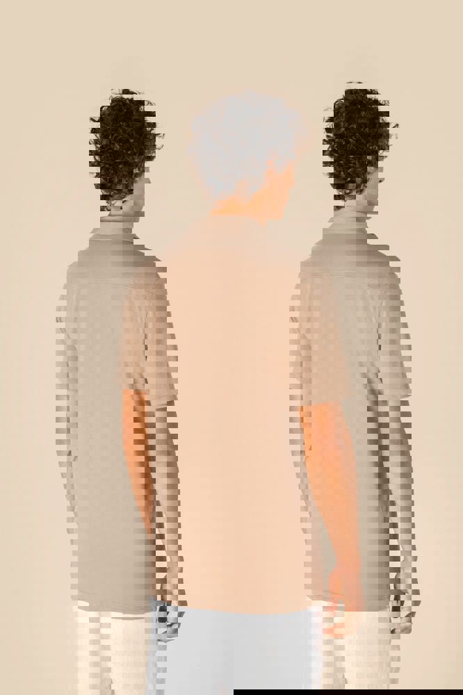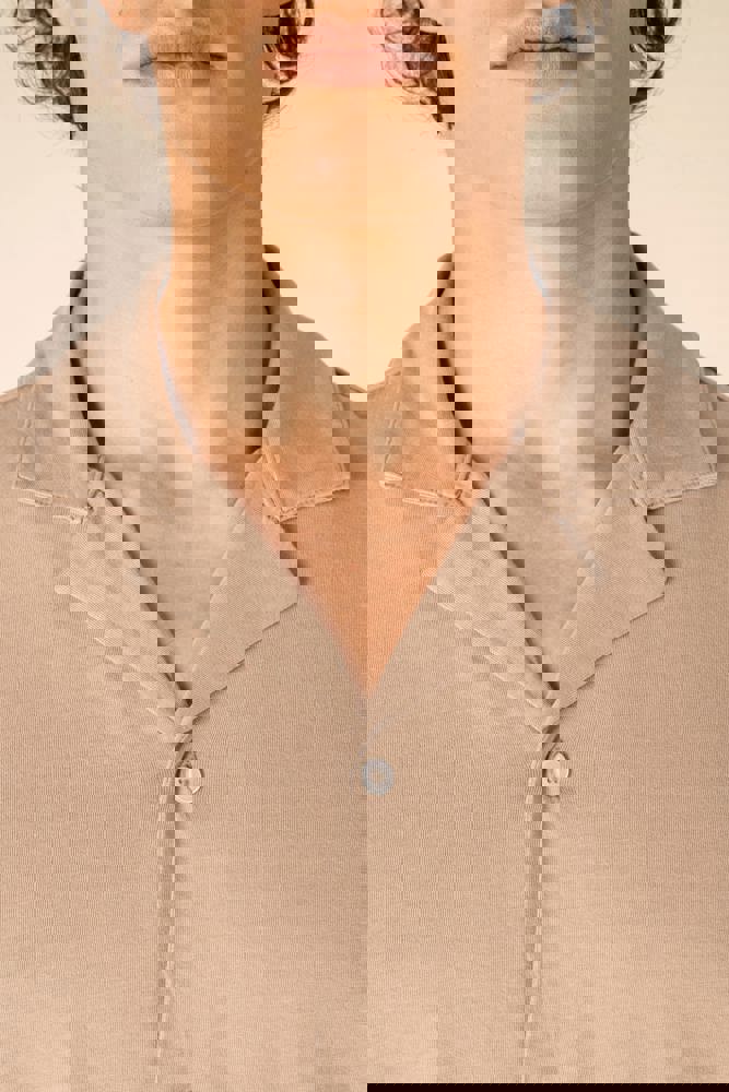 100% biokatoen. Gekamd katoen. Jerseytricot. Rechte snit. Verwassen look. Bowlingkraag. Knooplijst met contrasterende parelmoerlook knopen van gerecycled plastic. De mouwuiteinden en de boorden zijn afgewerkt met een enkel stiksel. Gevoerd rugstuk. Kledingstuk geverfd na montage: mogelijk zijn er lichte kleurverschillen tussen de producten. Dit product kan afgeven in contact met lichtere stoffen of kleding.