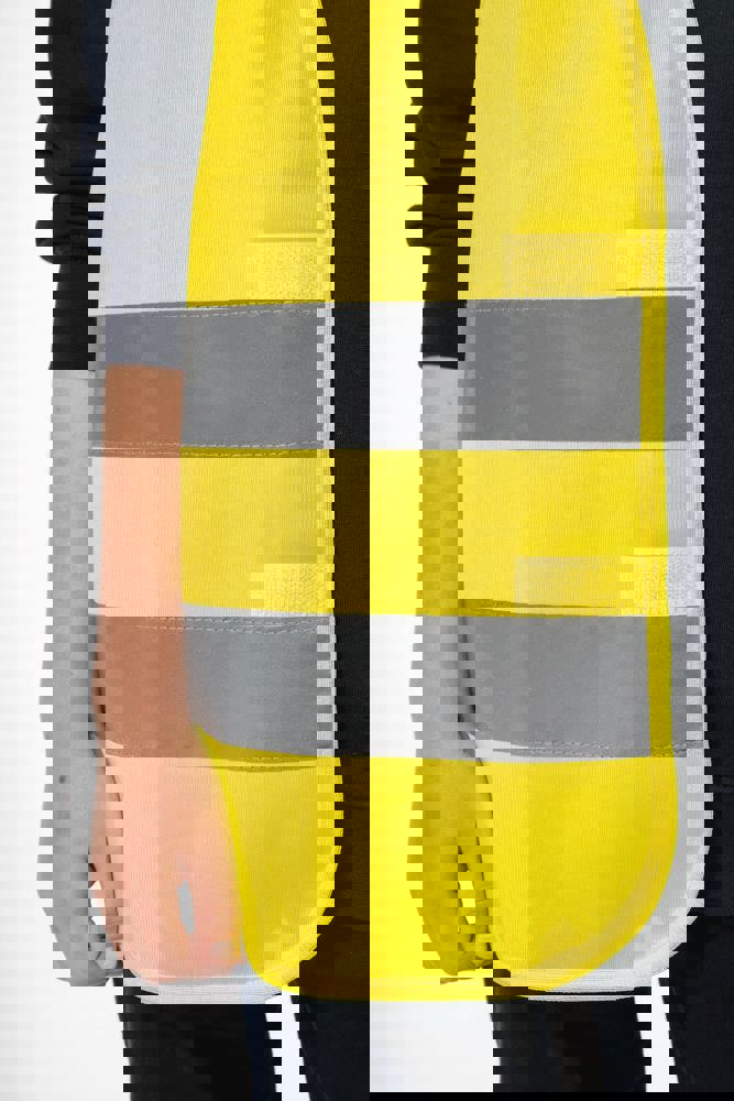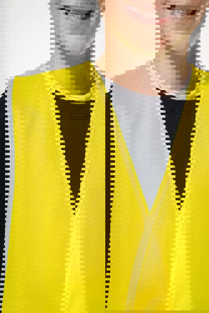 100% polyester. Polytricot. Easy care behandeling. Wasbaar op 40°C (25 wasbeurten). Ruime pasvorm. 2 horizontaal genaaide reflecterende banden van 5 cm op het lichaam. Klittenbandsluiting (1 verticale en 2 horizontale) voor optimale afstelling. Ophanglus aan de binnenkant van de kraag. Afwerkingsbies in ton sur ton. PBM Klasse II. Normen NF EN ISO 13688:2013 + NF EN ISO 13688/A1:2021 (Algemene eisen voor beschermende kleding). NF EN 17353:2020: Type AB3 (Beschermende kleding - Verbeterde zichtuitrusting voor situaties met een gematigd risico). Afneembaar merketiket.