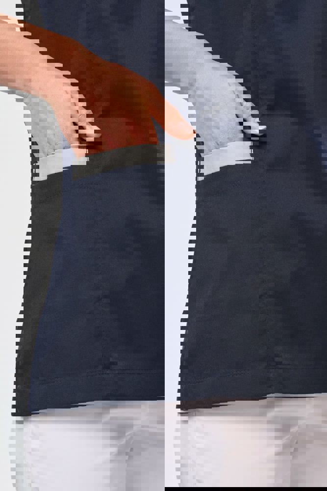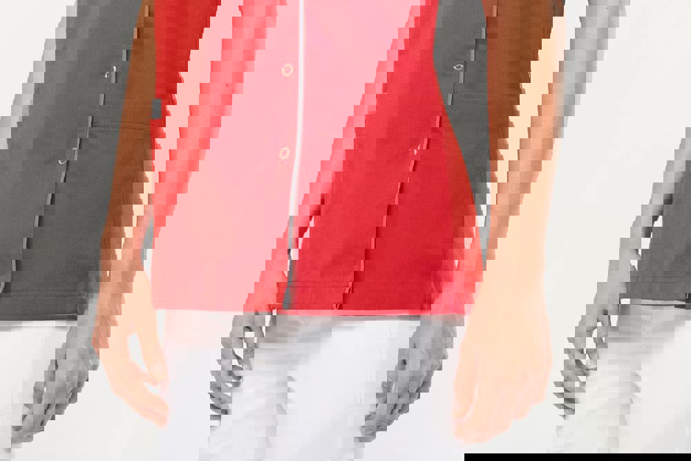 65% polyester / 35% katoen. Polykatoenen twill-stof. Wassen op 60°C. Vrouwelijke, rechte snit dankzij plooien aan de voor- en achterkant. V-hals, asymmetrische sluiting met drukknoopjes. 2 zakken vooraan, waarvan één (rechts) met twee vakjes (binnenzak met contrasterende boord). Contrasterende bies aan de halsopening en langs de knoopsluiting. Naamlabel aan de binnenkant. Tear-away merklabel.