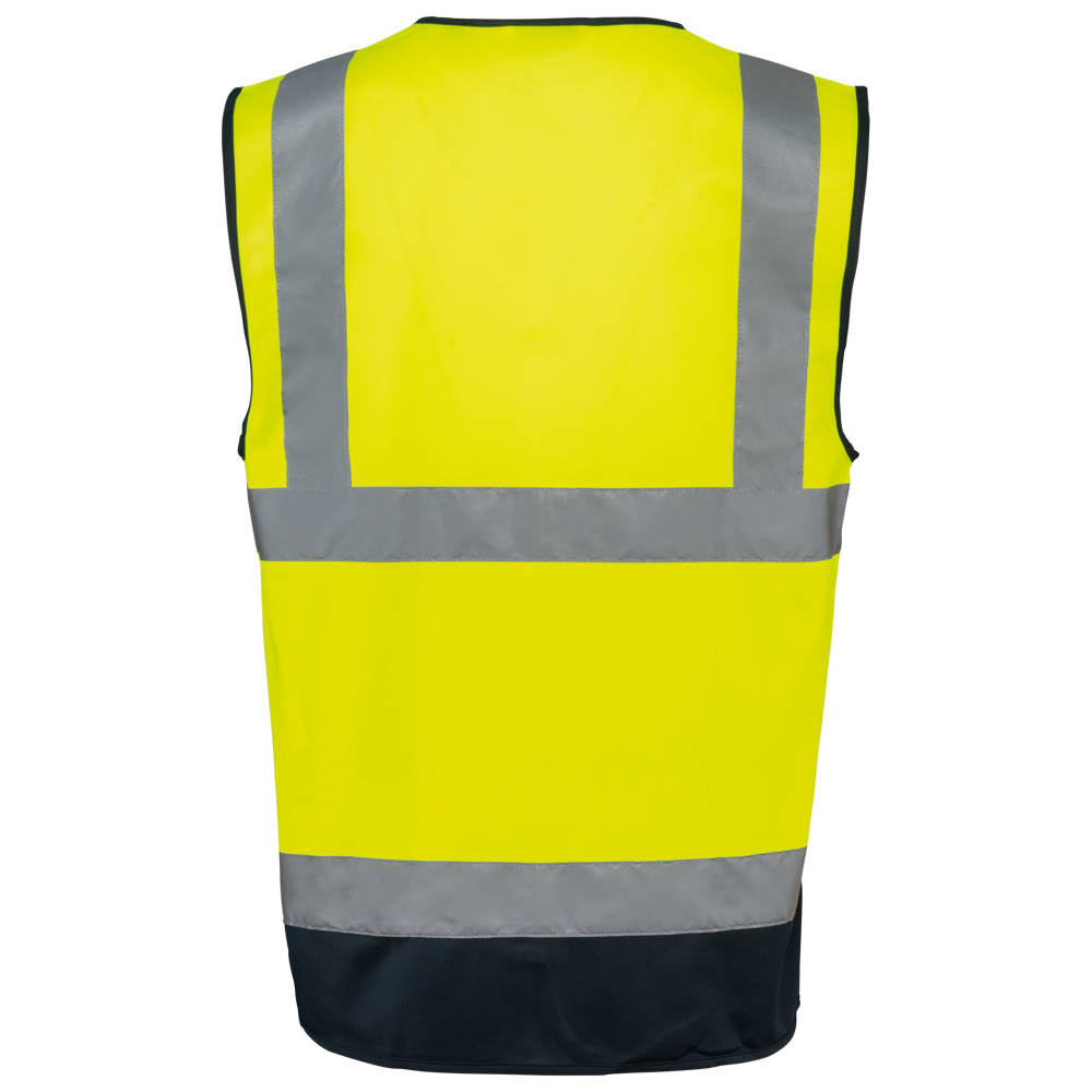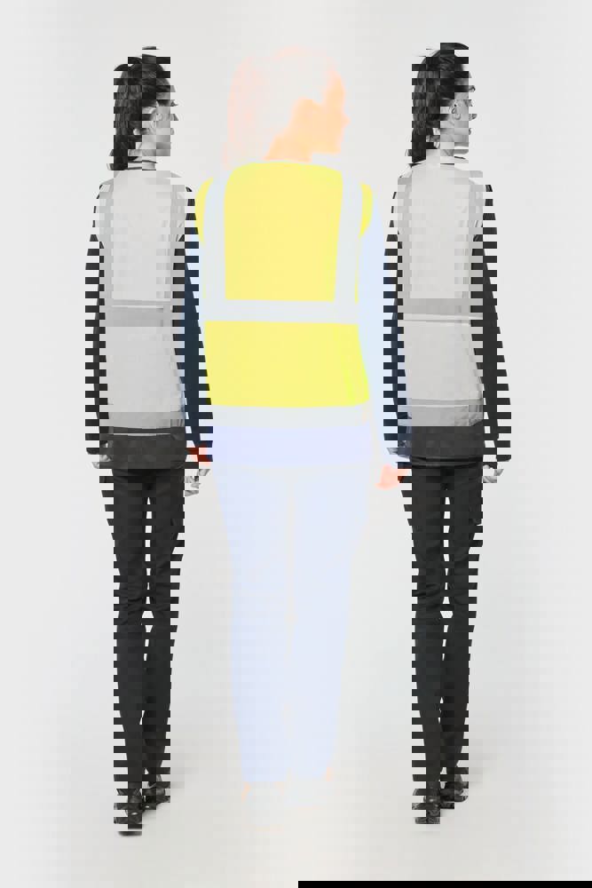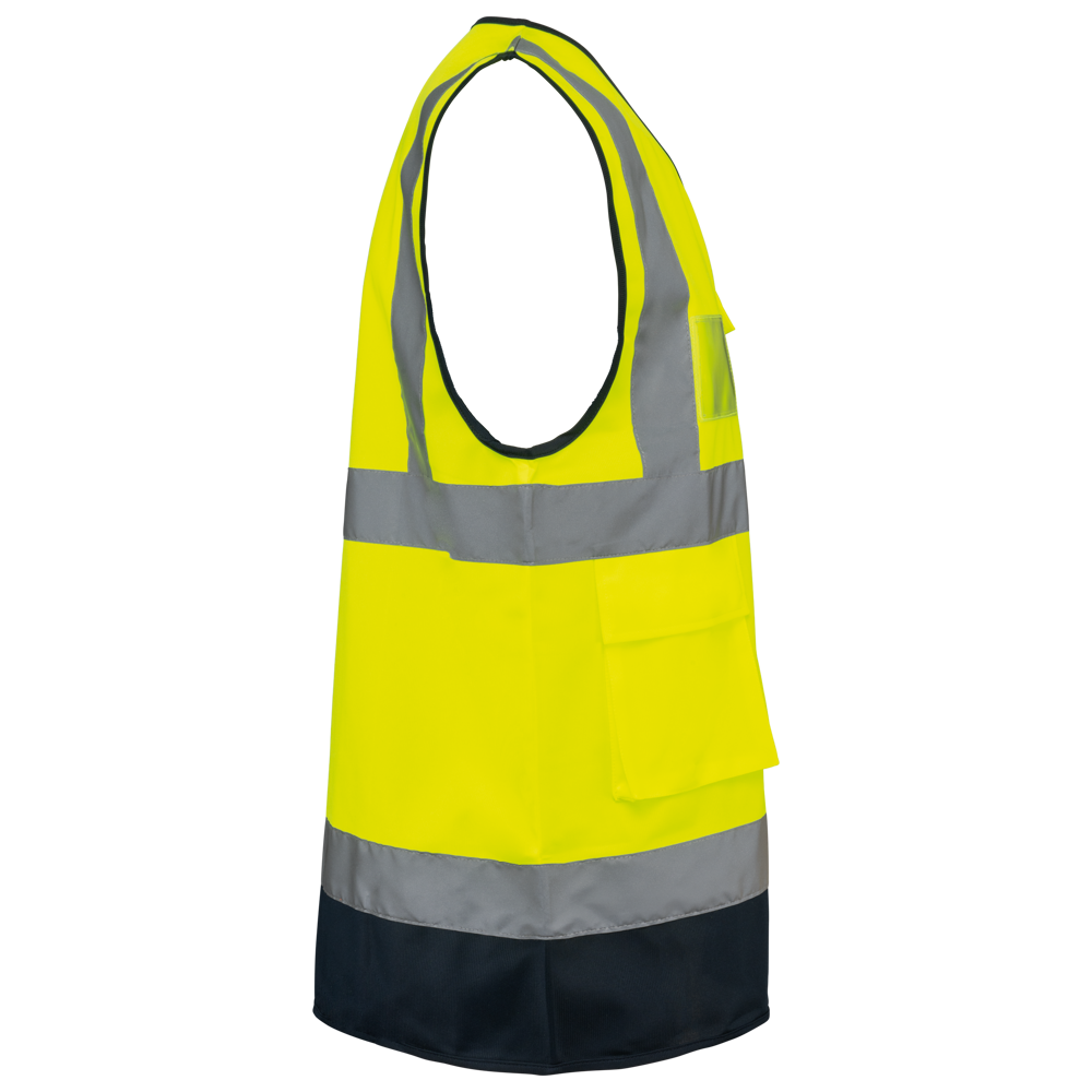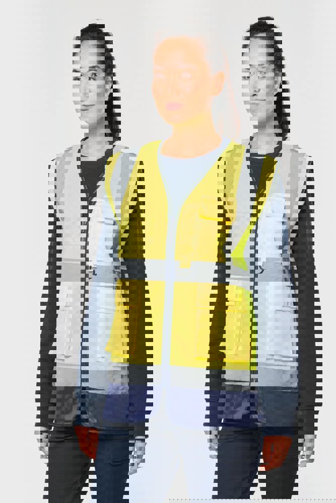 100% gerecycled polyester. Polytricot. Easy care behandeling. Wasbaar op 40°C (25 wasbeurten). Ruime pasvorm. 2 verticaal genaaide reflecterende banden van 5 cm op het lichaam en 2 horizontaal genaaide reflecterende banden van 5 cm aan de voor- en achterkant van het lichaam. Sluiting met kunststof rits (contrasterend bij tweekleurige modellen). 2 voorzakken met plooien en sluiting met klittenband. Rechterborstzijde bij dragen: 1 plooi voorzak met klittenbandsluiting + 1 compartiment met 2 penhouders + 1 plastic ring bevestigd onder het compartiment. Linkerborstzijde bij dragen: 1 transparante PVC-kaarthouder. Afwerkingsbies (contrasterend bij tweekleurige modellen). Ophanglus aan de binnenkant van de kraag. PBM Klasse II. Normen NF EN ISO 13688:2013 + NF EN ISO 13688/A1:2021 (Algemene eisen voor beschermende kleding), NF EN ISO 20471:2013 + NF EN ISO 20471/A1:2017: Klasse 1 voor effen kleuren in maat XS - Klasse 2 voor effen kleuren van maat S t/m 5XL - Klasse 1 voor tweekleurige modellen van maat XS t/m L - Klasse 2 voor tweekleurige modellen van maat XL t/m 5XL (Hoge zichtbaarheid kleding - testmethoden en eisen), RIS-3279-TOM Issue 2:2019 alleen voor de kleuren Hi Viz oranje en Hi Viz Oranje/Marineblauw Klasse 2 (Spoorwegindustrie norm). Afneembaar merketiket.