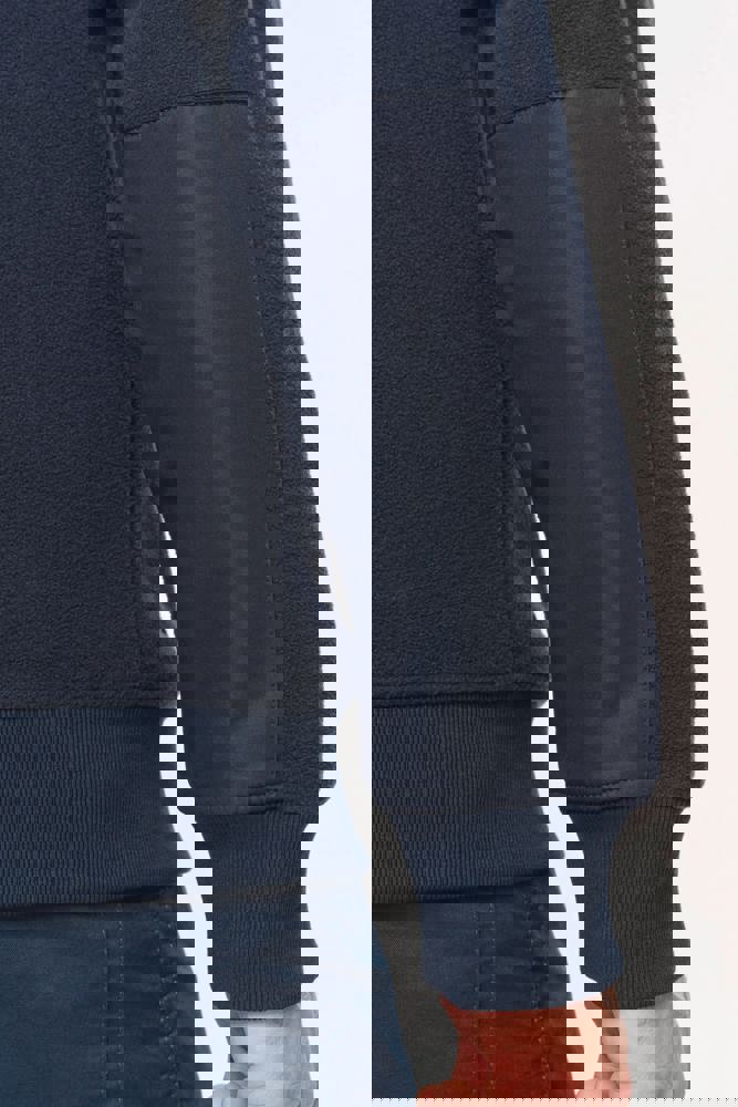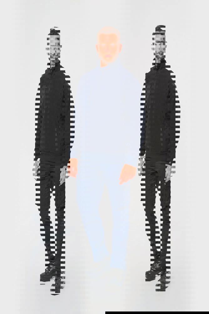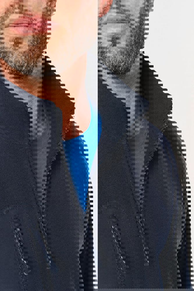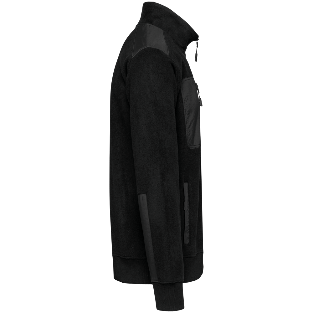 100% gerecycleerd polyester post-consumer. Rechte snit. 2 ritszakken met bies in taslan met ritstrekker aan de voorkant. 1 afgerond borstzakje met rits en ritstrekker in taslan met toon-op-toon stiksel rechts (bij het dragen). Kraag gevoerd met 2x2 ribtricot en rits van gerecycleerd plastic + ophanglus in de kraag. Verstevigende inzetsels aan schouders en voorarm in taslan. 2x2 ribboord in buisconstructie aan de mouwuiteinden en de onderkant. Afneembaar merklabel.