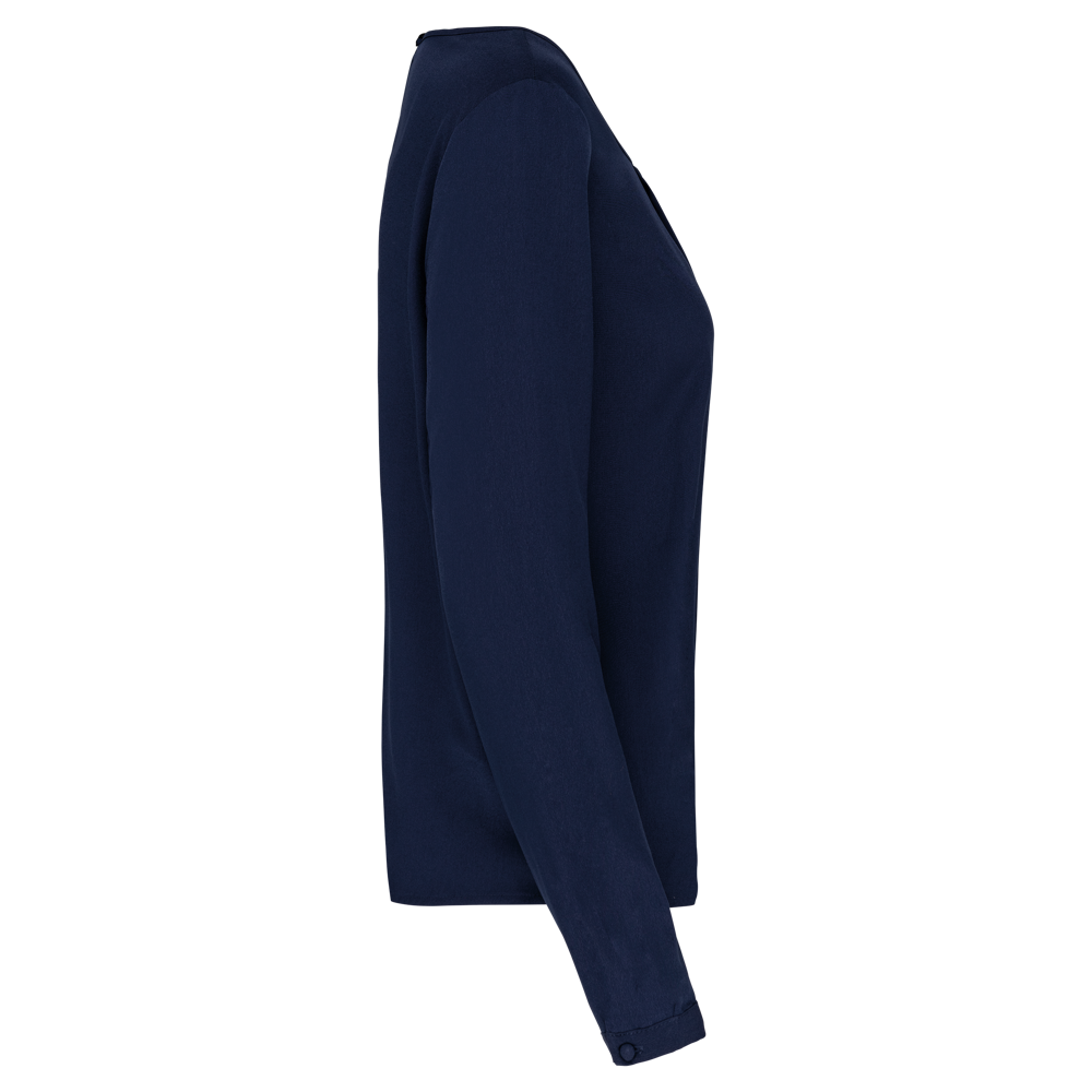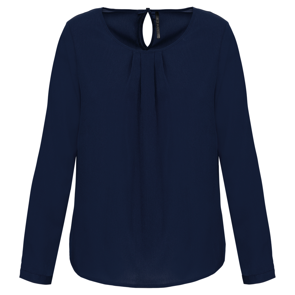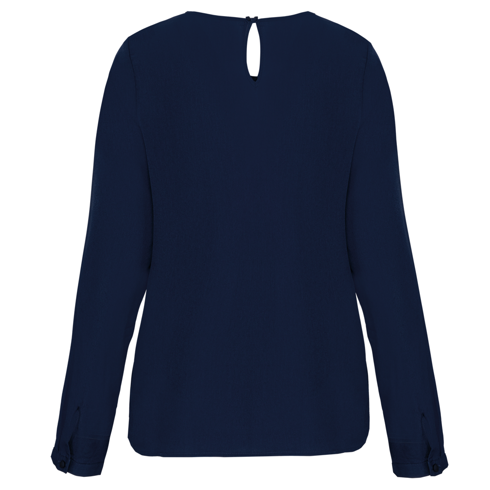 100% polyester. Soepele en lichte crêpe. Ronde hals met biesje. Fronsjes aan de halsopening aan de voorkant. Sluiting aan de achterkant en aan de onderkant van de mouwen door middel van een afgedekte knoop.