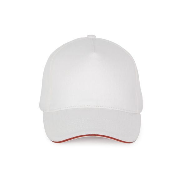 100% katoen. Pet met 5 panelen. Verstelbare sluiting met metalen gesp en zelfblokkerende lus.