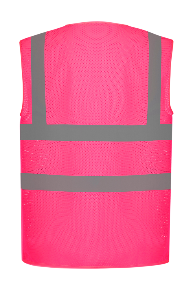 100% polyester. 100% gerecycled polyester. Gemaakt van petflessen. Gemaakt van ademende, licht gebreide gaas. 5 cm brede reflectieband rond het lichaam en over elke schouder. Velcro® sluiting vooraan. Conform aan de Amerikaanse Nationale Norm ANSI/ISEA 107-2004 en Europese EN ISO20471:2013 Klasse 2 : enkel Hi-Vis Orange en H-Vis Yellow.