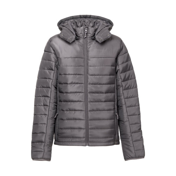 Damesjas met capuchon van 100% gerecycled nylon ripstop (350 g/m²), de binnenkant is gevoerd met 100% gerecycled nylon taffeta (350 g/m²) voor meer draagcomfort. De capuchon is gewatteerd en heeft verschillende kenmerken: een elastische band, twee drukknopen en een ritssluiting die kan worden verwijderd. Opening aan de voorkant met YKK® rits - een merk dat gebruik maakt van moderne apparatuur met een hoge kwaliteitscontrole - en trekker. Het heeft twee voorzakken met ritsen en trekkers en twee binnenzakken met zelfklevende ritsen. Op de onderrug zit een toegang met rits voor eenvoudige personalisatie. Maten: XS, S, M, L, XL, XXL