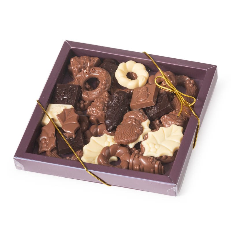 Een fraai geschenkdoosje gevuld met Belgische kerstchocolade in wit, melk en puur, 250 gram. Een mooi cadeau voor iemand die het verdient! INHOUD: • Echte Belgische kerstchocolade in wit, melk en puur verpakt in luxe geschenkverpakking voorzien van gouden strikje, 250 gram. Heerlijk om met elkaar van te genieten tijden de feestdagen! Met meerdere verpakt in een verzenddoos. Geen garantie op breukvrije overkomst. Breuk wordt niet vervangen of vergoed.