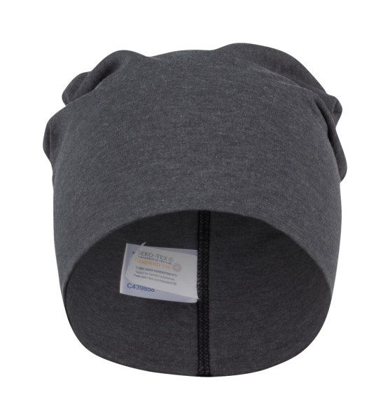 Dubbelgelaagde beanie in single jersey met flatlock naden in contrasterende kleur.