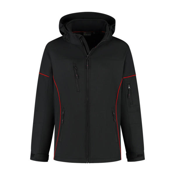 Softshell met contrast piping, 94% gerecycled polyester / 6% elastan (GRS gecertificeerd) , 310 gr/m², 3-laags softshell met microfleece als binnenlaag, unisex, stretch regular fit met opstaande kraag en afritsbare capuchon, voorsluiting met windvanger YKK rits met puller, 2 steekzakken, borstzak en mouwzak met YKK rits en puller, gevoerde mouwen met verstelbare manchetten en windstoppers. Winddicht, ademend, waterafstotend en onderzijde verstelbaar middels koord met stopper, 3D logo transfer op onderzijde.