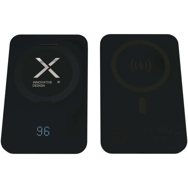 Slanke 5000 mAh powerbank met MagSafe-technologie, gemaakt van gerecycled aluminium en gerecycled plastic. Hij heeft een digitaal display aan de voorkant dat het batterijniveau als percentage weergeeft. Een inklapbare ringstandaard stelt je in staat de telefoon verticaal of horizontaal te plaatsen voor optimaal gebruik tijdens het opladen. Voor telefoons zonder ingebouwde MagSafe-technologie (iPhone 12 en nieuwer) is een magnetische ring inbegrepen. De powerbank is aanpasbaar met een lasergegraveerd spiegelend logo en wordt geleverd in een gerecycled kartonnen schuifgeschenkverpakking.