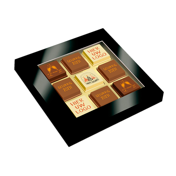 Vierkant doosje met venster. In het doosje zit een tray met 9 pralines. De witte pralines wordt voorzien van een full colour bedrukking. De bruine pralines worden voorzien van een standaard bedrukking in een vaste kleur (brievenbus verzenddoosje €1,00 per stuk)Smaken: Wit caramel crunch & Melk Espresso