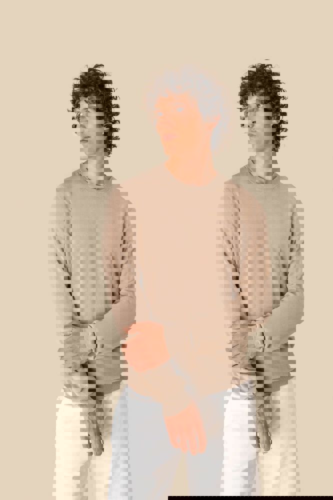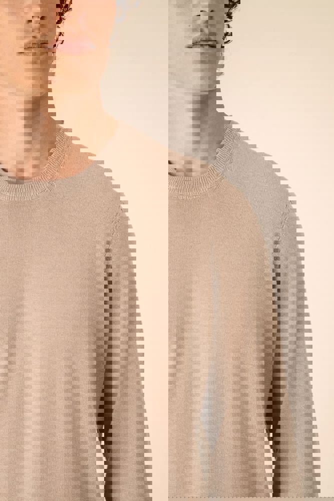 100% biologisch katoen. Gekamd katoen. Gauge 12. Rechte snit. 1x1 ribboord aan kraag, zoom en mouwuiteinden. 'Fully Fashion' gebreid. Behandeld tegen pluizen. De hals is aan de binnenkant afgewerkt met ton-sur-ton nektape in de hoofdstof. Gemiddeld gewicht in maat L: 270 g.