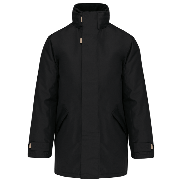 Buitenkant: 100% oxford polyester. Binnenkant: gewatteerd polyester. 2 voorzakken met rits. 2 binnenzakken waarvan 1 voor de GSM. Afneembare capuchon in de kraag. Kraag gevoerd met fleece. Drukkersrits. Waterdichte naden. Ritssluiting verborgen onder een lijst met drukknopen en klittenband. Verstelbare mouwuiteinden.