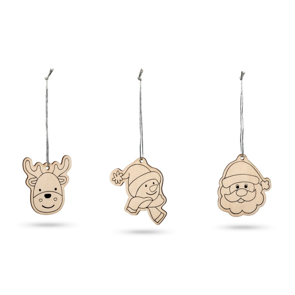 Set om hout te verven. Inclusief 3 Kerst decoraties met te verven kleurplaten, lintjes om aan op te hangen en 4 kleurpotloden. Vanwege het natuurlijke materiaal kunnen de kleur van het product en het drukresultaat per product afwijken. 122 x 94 x 14 mm