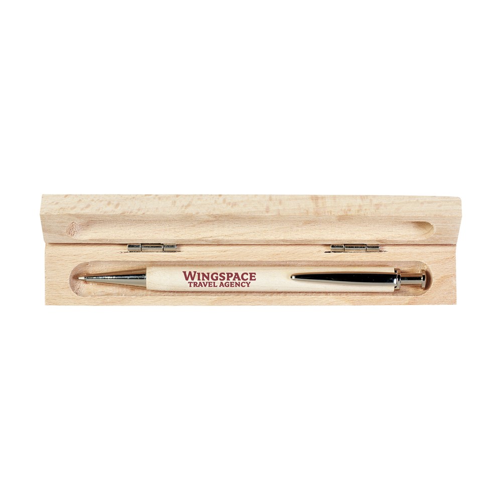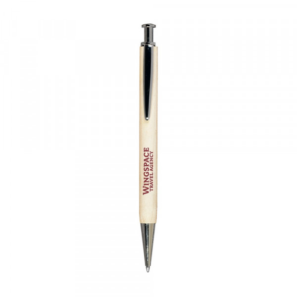Blauwschrijvende balpen van massief beukenhout met verchroomde clip, drukknop, puntstuk. In beukenhouten cassette.
