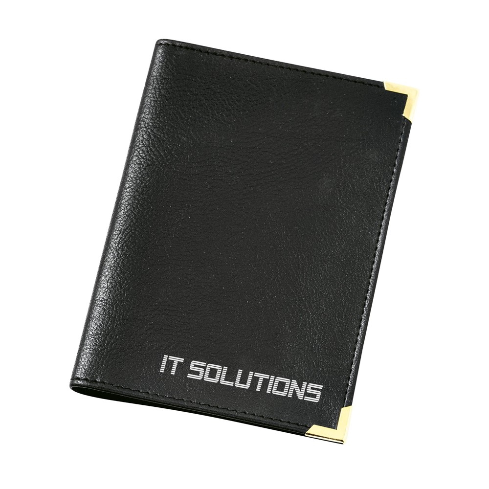 Autopapierenportefeuille van imitatieleer, met metalen beschermhoekjes.